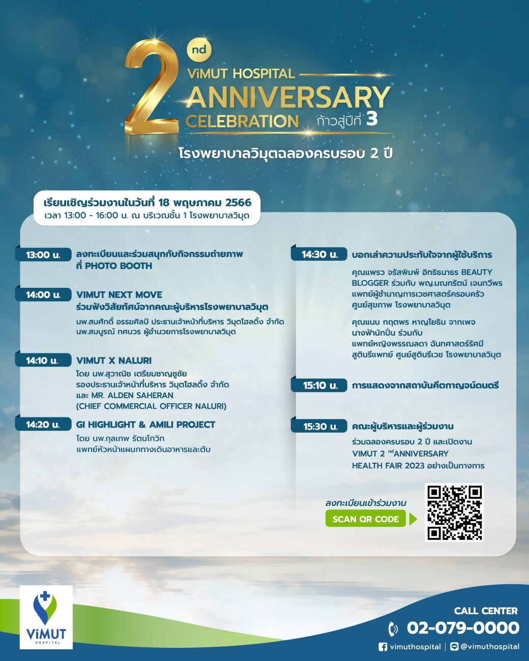 โรงพยาบาลวิมุต โรงพยาบาลเอกชนชั้นนำใจกลางกรุงเทพฯ ฉลองครบรอบ 2 ปีแห่งความสำเร็จ และประกาศความพร้อมเดินหน้าสู่ปีที่ 3 ในการเป็น Healthcare Platform เต็มรูปแบบ ตอกย้ำความเป็นเลิศด้านบริการสุขภาพที่ผสานความเชี่ยวชาญเฉพาะโรค นวัตกรรมทางการแพทย์ที่ทันสมัย และเทคโนโลยีการเชื่อมต่อออนไลน์ตลอด 24 ชั่วโมง รวมถึงการสร้างเสริมสุขภาวะแบบบูรณาการสำหรับคนทุกช่วงวัย พร้อมกันนี้ยังได้จัดกิจกรรม Health Fair ตั้งแต่วันที่ 18 – 21 พฤษภาคม 2566 เพื่อมอบของขวัญแห่งความสุขผ่านโปรโมชั่นสุขภาพดีแบบสุดคุ้ม ด้วยส่วนลดแพ็กเกจตรวจสุขภาพและความงามสูงสุด 70% พร้อมลงทะเบียนลุ้นรับรางวัลแพ็กเกจตรวจสุขภาพฟรีอีกมากมาย พร้อมรับสิทธิ์ใช้งานฟีเจอร์ใหม่ ViMUT Cares ที่ระดมทีมสหสาขา อาทิ แพทย์ นักจิตวิทยา นักกำหนดอาหาร ฟิตเนสโค้ช และเภสัชกร ร่วมดูแลคุณ 24 ชั่วโมง
