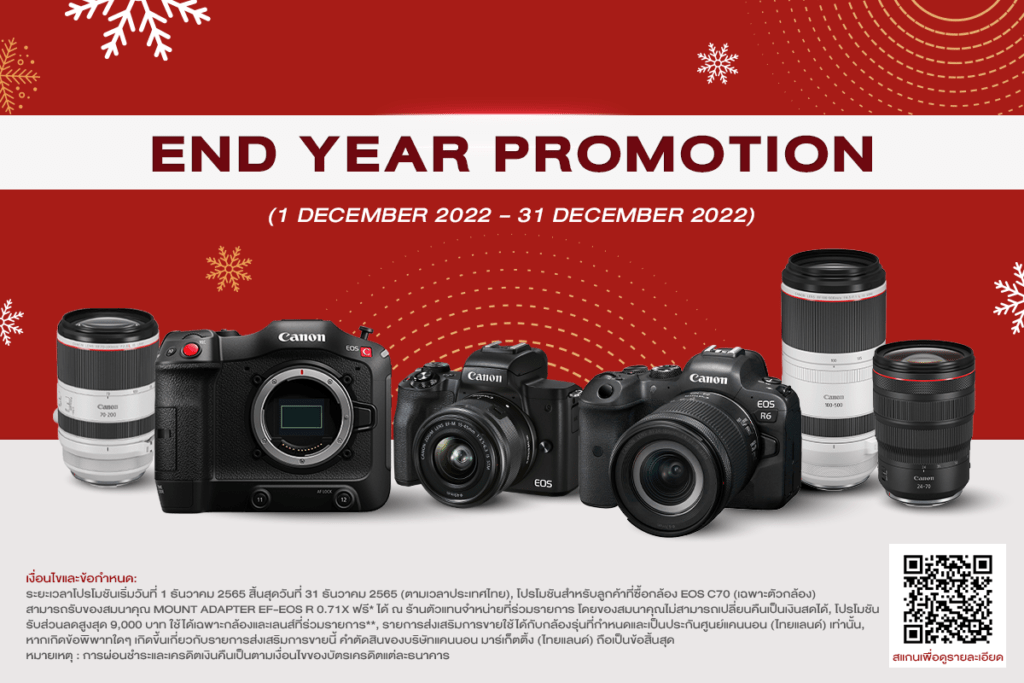 บริษัท แคนนอน มาร์เก็ตติ้ง (ไทยแลนด์) จำกัด (Canon) ชวนช้อปชวนฟินส่งท้ายปี เอาใจช่างภาพและสาวกคอนเทนต์ ครีเอเตอร์ ยกขบวนกล้องและเลนส์สุดฮอตในราคาสุดคุ้ม จัดโปรโมชัน ‘Canon End Year Promotion’ ลดกระหน่ำสูงสุงในรอบปี ทั้งกล้องในตระกูล EOS และเลนส์ RF หลากหลายรุ่น รวมถึงกล้องคอมแพคกระดับพรีเมียม พร้อมตอบโจทย์ช่างภาพทุกระดับ ให้คุณสนุกกับการเก็บภาพประทับใจในเทศกาลแห่งความสุขอย่างคุ้มค่าสูงสุด 9,000 บาท3 หรือรับฟรีของสมนาคุณฟรี1,2 ตั้งแต่วันนี้ – 31 ธันวาคม 2565 ตามร้านตัวแทนจำหน่ายที่ร่วมรายการทั่วประเทศและตามที่เงื่อนไขกำหนด ดูรายละเอียดเพิ่มเติม
