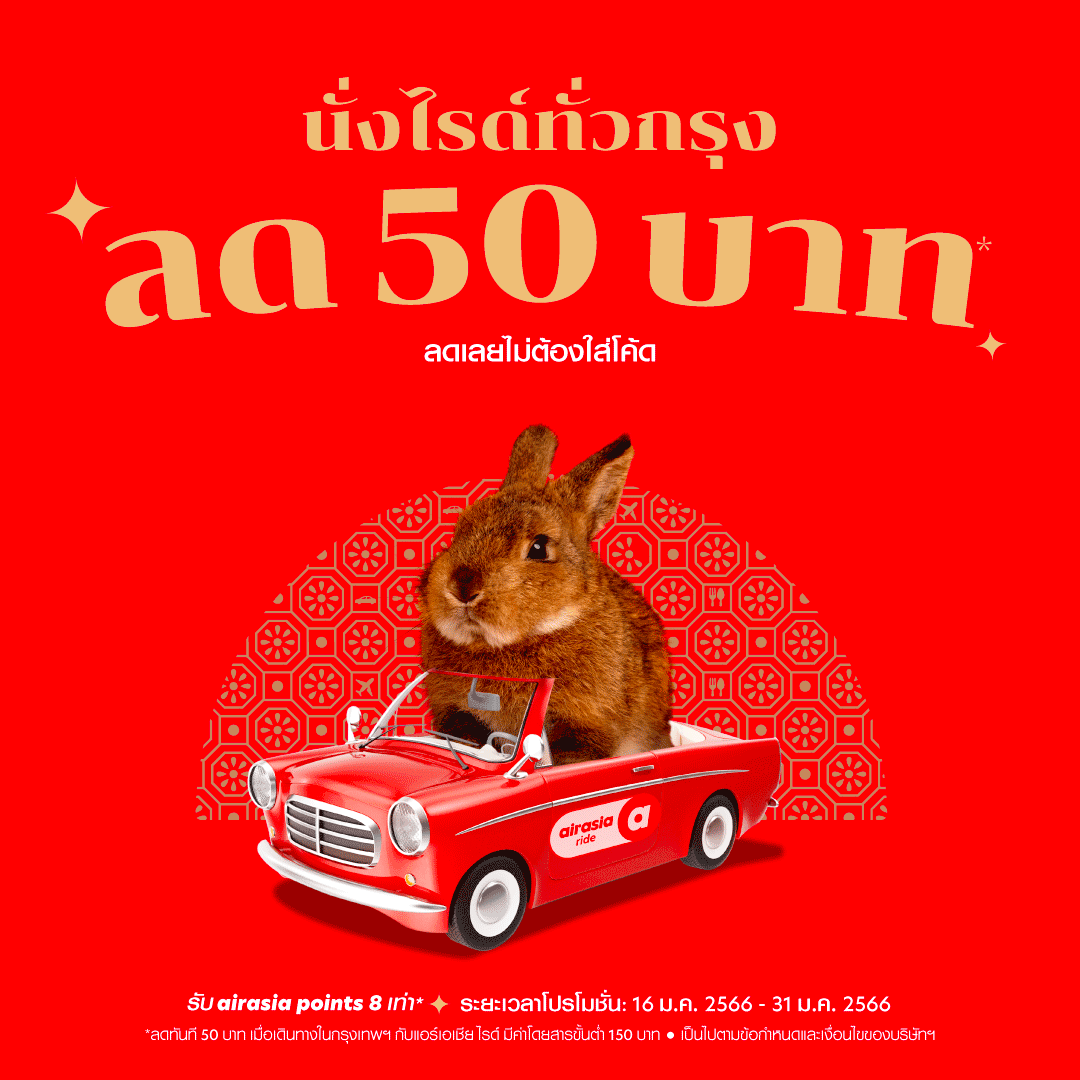 1. airasia Ride – รับทันทีส่วนลด 50 บาท (ไม่ต้องใส่โค้ด) เมื่อใช้บริการเรียกรถรับส่งผ่าน airasia ride เพียงมียอดค่าโดยสารขั้นต่ำ 150 บาท พร้อมรับ airasia points 8 เท่า