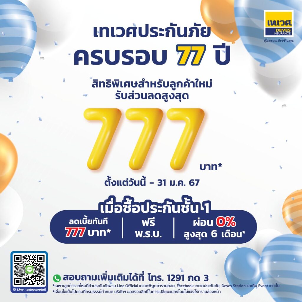 เทเวศประกันภัย ฉลองครบรอบ 77 ปี เสนอสิทธิพิเศษสำหรับลูกค้าใหม่ ที่ทำประกันผ่านช่องทาง Facebook Fanpage เทเวศประกันภัย, Line Official เทเวศประกันภัย และ Line Official เทเวศลูกค้ารายย่อย คุ้ม 3 ต่อ เมื่อซื้อประกันชั้น 1 ต่อที่ 1 รับส่วนลดเบี้ยประกันภัยทันที 777 บาท  ต่อที่ 2 ฟรี พ.ร.บ. และต่อที่ 3 ผ่อน 0% สูงสุด 6 เดือน ตั้งแต่วันนี้ – 31 มกราคม 2567