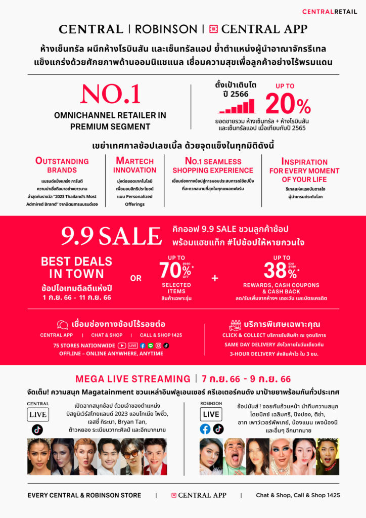 ห้างเซ็นทรัลและห้างโรบินสัน ในเครือเซ็นทรัลรีเทล ผนึกกำลังครองพื้นที่ช้อปวันเลขเบิ้ลแบบออมนิแคมเปญทั้งออฟไลน์และออนไลน์ กระตุ้นยอดขายด้วยโปรโมชันและกิจกรรมตลอด 4 เดือนสุดท้ายคิกออฟด้วย “Central / Robinson 9.9 Sale” ผ่านคอนเซ็ปต์ #ไปช้อปให้หายกวนใจ ตอบรับมู้ดจับจ่ายนักช้อปด้วยส่วนลดสูงสุด 70% และสินค้าดีลพิเศษ Best Deals In Town ชวนทุกคนช้อปกันให้สุดแบบไม่ค้างคาใจ มอบประสบการณ์การช้อปปิ้งที่ตรงใจลูกค้าและพรีเมียมที่สุด สมตำแหน่งห้างสรรพสินค้าออมนิแชแนลอันดับ 1 ของไทย (The #1 Omnichannel Retailer in Premium Segment) ผ่านจุดแข็งด้าน “Omnichannel Retailer” ได้แก่