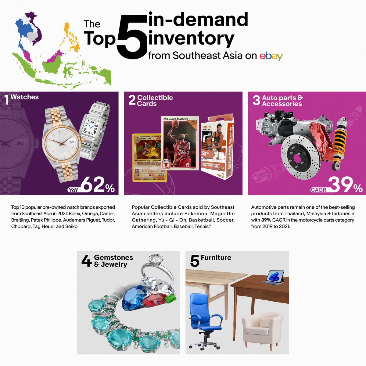 นาฬิกาหรูมือสองจากสิงคโปร์ ฟิลิปปินส์ มาเลเซีย และอินโดนีเซีย เป็นสินค้าที่มีความต้องการสูงในหมู่ผู้ซื้อจากสหรัฐฯ เห็นได้จากการที่ในปี 2564 ยอดขายนาฬิกาหรูที่มีราคาขายเฉลี่ยสูงกว่า 2,000 เหรียญสหรัฐฯ เติบโตมากกว่า 62% เมื่อเทียบกับปีที่ผ่านมา โดยพบว่า 10 แบรนด์เด่นที่ผู้ขายจากเอเชียตะวันออกเฉียงใต้ส่งออกไปยังผู้ซื้อทั่วโลกผ่านอีเบย์ในปี 2564 ได้แก่ Rolex, Omega, Cartier, Breitling, Patek Philippe, Audemars Piguet, Tudor, Chopard, Tag Heuer และ Seiko สะท้อนถึงความมั่นใจและไว้วางใจในการซื้อขายสินค้าราคาสูงบนแพลตฟอร์มอีเบย์