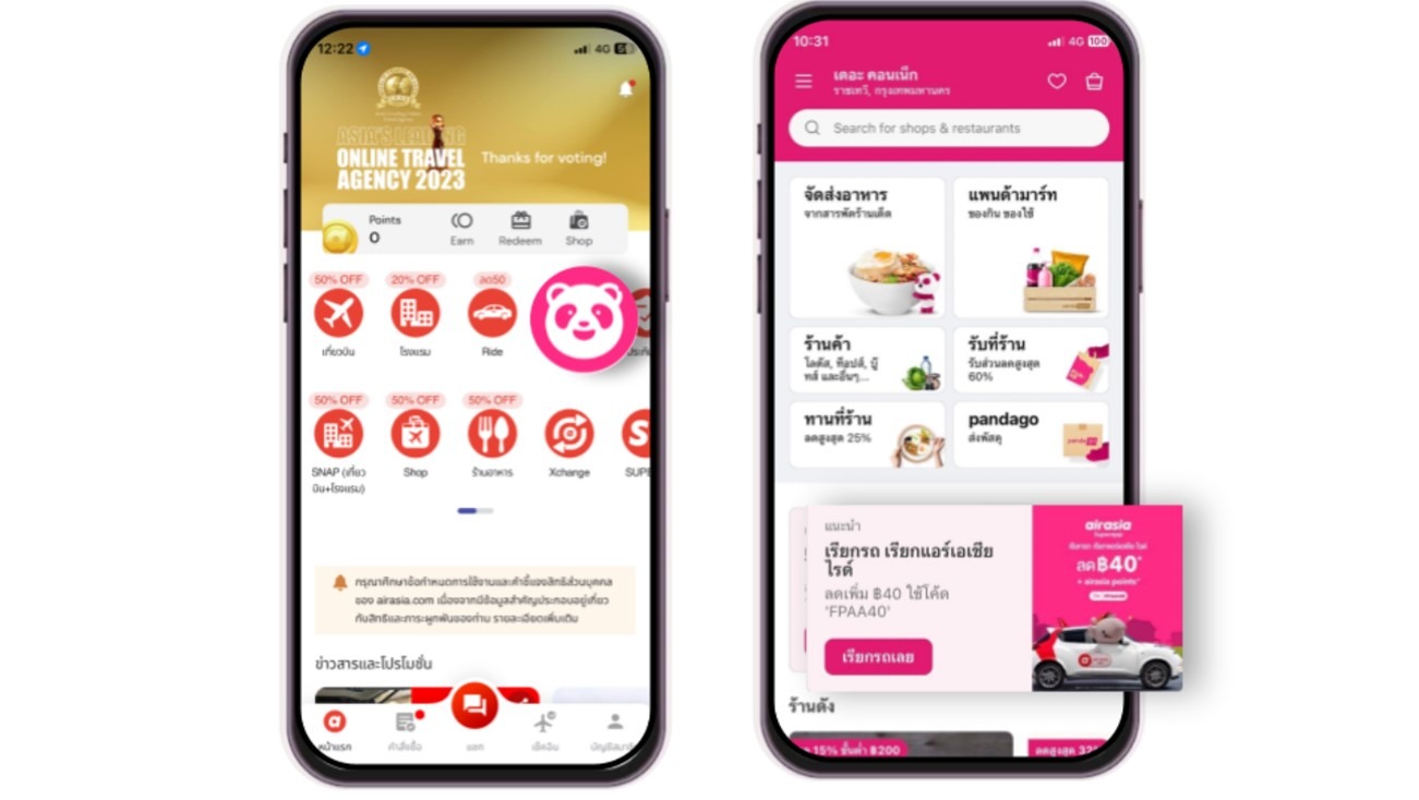 การผนึกกำลังครั้งนี้ ผู้ใช้งาน airasia Superapp สามารถเข้าถึงบริการฟู้ดเดลิเวอรี่ของ foodpanda ซึ่งมีเมนูอาหารและร้านสุดอร่อยให้เลือกหลากหลายจากพาร์ทเนอร์ร้านอาหารทั่วประเทศ ไม่ว่าอยู่ที่ไหนก็สามารถสั่งอาหารอร่อยมาลิ้มลองได้ทุกที่ทุกเวลา ในขณะเดียวกัน ลูกค้าของ foodpanda จะได้สัมผัสประสบการณ์ใหม่นอกเหนือจากบริการจัดส่งอาหารและของกินของใช่ ด้วยบริการเรียกรถจาก airasia ride ที่ราคาคุ้มค่าทุกเส้นทาง เรียกรถง่าย ไม่ว่าใกล้หรือไกลก็เดินทางได้อย่างสะดวก ตอบโจทย์ลูกค้าชาวไทยและนักท่องเที่ยวชาวต่างชาติ โดยทั้งสองบริการยังสามารถรับคะแนน airasia points เพื่อใช้แทนเงินสดจ่ายค่าสินค้าบริการ อาทิ ค่าตั๋วเครื่องบินทั้งสายการบินแอร์เอเชีย และสายการบินอื่น ๆ ค่าห้องพักโรงแรม และแลกดีลข้อเสนอด้านไลฟ์สไตล์กับพันธมิตรสุดพิเศษบน airasia Superapp ได้อีกด้วย