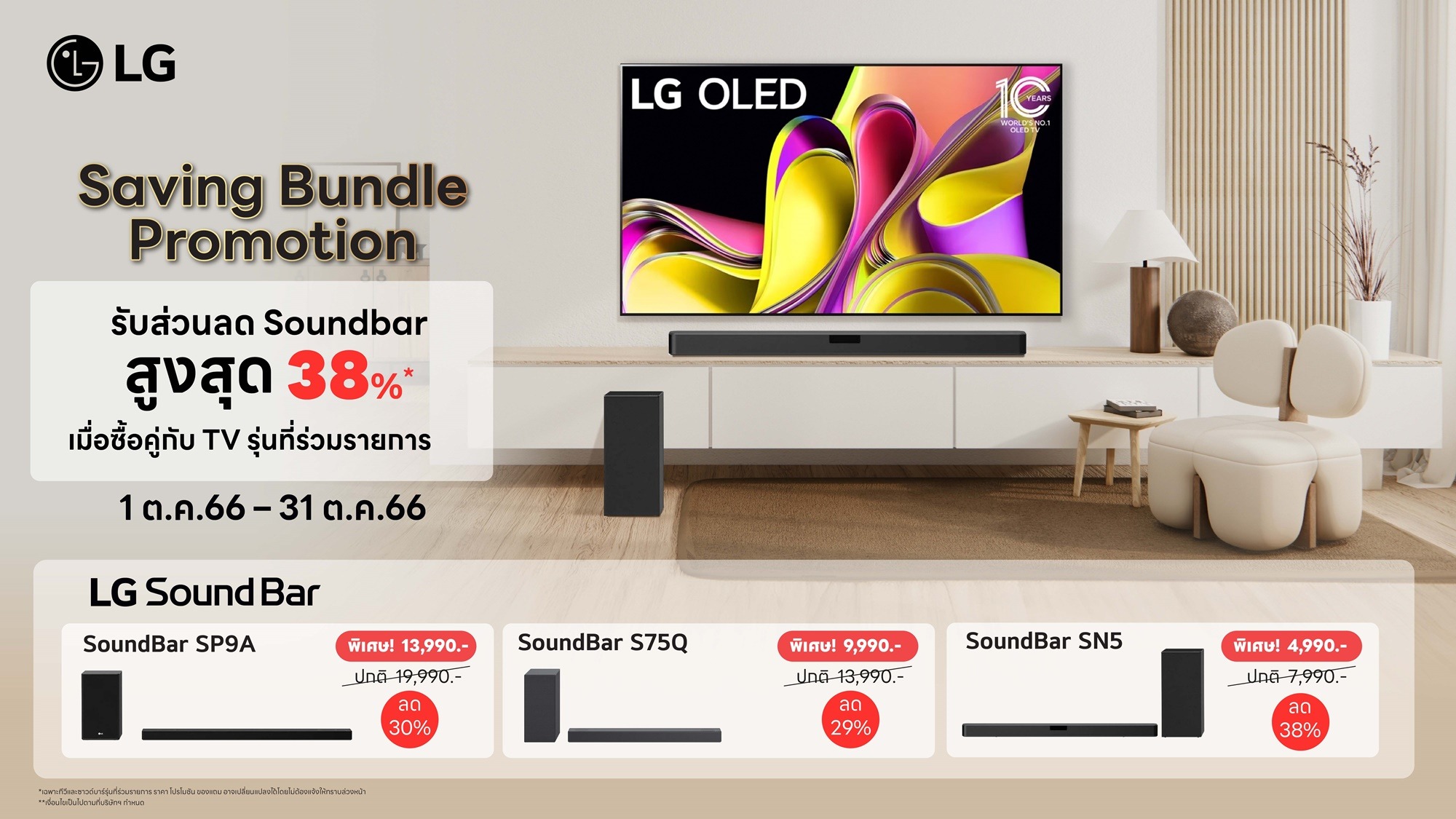 นอกจากนี้ยังมีโปรโมชัน Saving Bundle มอบส่วนลดสูงสุดถึง 38% เมื่อซื้อซาวด์บาร์ SP9A, S75Q หรือ SN5 คู่กับทีวีรุ่นที่ร่วมรายการ ณ ร้านค้าตัวแทนจำหน่ายเพาเวอร์บายทุกสาขา ตั้งแต่วันนี้ – 31 ตุลาคม 2566