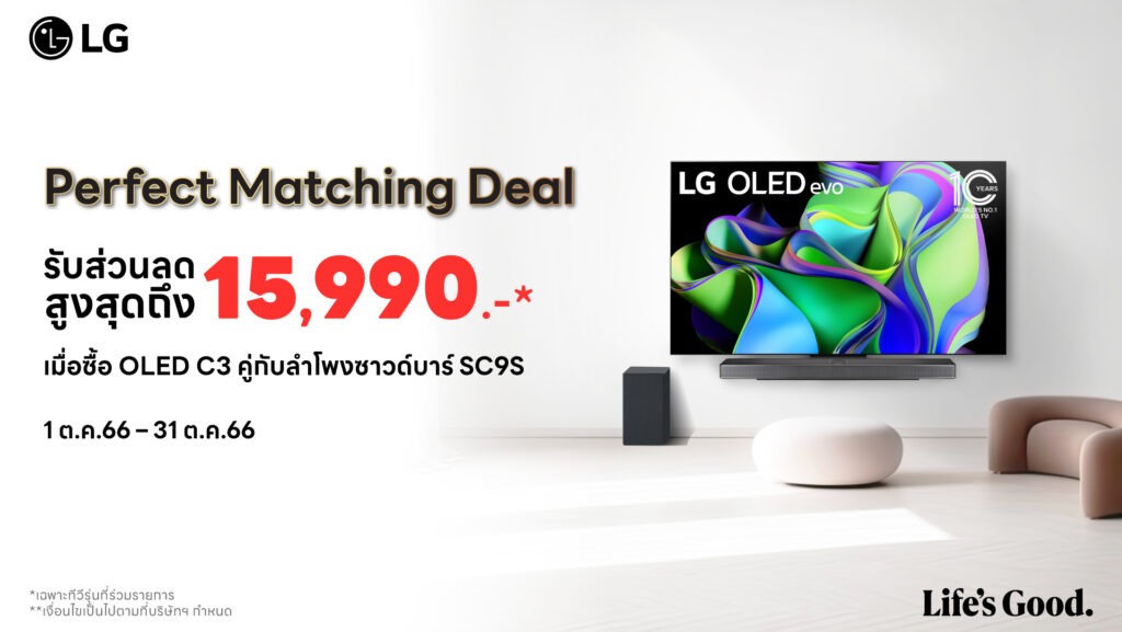โปรโมชัน Perfect Matching Deal มอบส่วนลดสูงสุด 15,990 บาท เมื่อซื้อทีวี OLED evo ซีรีส์ C3 กับซาวด์บาร์ SC9S ณ ร้านค้าตัวแทนจำหน่าย โฮมโปร เพาเวอร์บาย และพาวเวอร์มอลล์ทุกสาขา หรือซื้อสินค้าได้ที่ www.lg.com/th ตั้งแต่วันนี้ – 31 ตุลาคม 2566 โดยทีวีรุ่นที่ร่วมรายการ ได้แก่