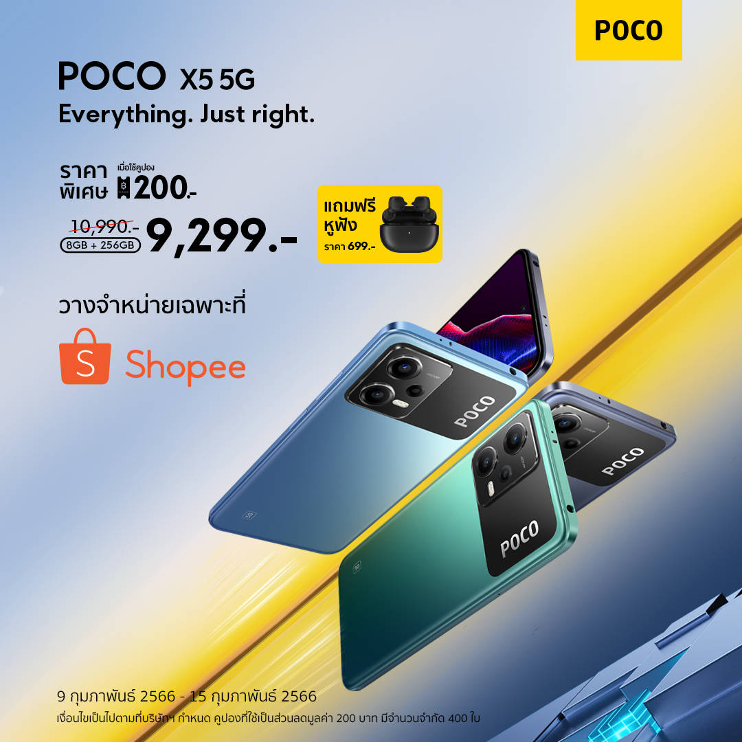 POCO ประเทศไทย พร้อมวางจำหน่ายสมาร์ทโฟน 2 รุ่นใหม่ POCO X5 Pro 5G และ POCO X5 5G อย่างเป็นทางการในประเทศไทย พิเศษ! สำหรับลูกค้าที่ซื้อสินค้าในระหว่างวันที่ 9-15 กุมภาพันธ์ 2566 สามารถรับโปรโมชันพิเศษได้โดย POCO X5 Pro 5G จัดโปรโมชันพิเศษ 11,290 บาท (จากราคาปกติ 12,990 บาท) เมื่อลูกค้ากดรับคูปองส่วนลดขณะซื้อสินค้า พร้อมรับฟรี หูฟัง earbuds มูลค่า 699 บาทเฉพาะที่ Lazada เท่านั้น สำหรับ POCO X5 5G จัดโปรโมชันพิเศษ 9,299 บาท (จากราคาปกติ 10,990 บาท) เมื่อลูกค้ากดรับคูปองส่วนลดขณะซื้อสินค้าโดยคูปองมีจำนวนจำกัด 400 สิทธิ์ พร้อมรับฟรี หูฟัง earbuds มูลค่า 699 บาท เฉพาะที่ Shopee เท่านั้น!
