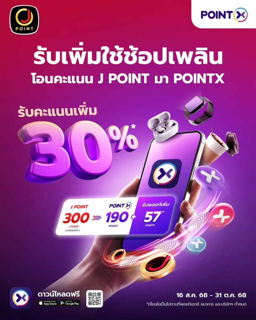 POINTX (พอยท์เอกซ์) แอปพลิเคชันรวมและแลกคะแนนสะสม ที่แลกง่าย ใช้คุ้ม เดินหน้าขยายพันธมิตรใหม่ เสริมแกร่งระบบสะสมคะแนนให้หลากหลายและครอบคลุมยิ่งขึ้น ล่าสุดประกาศความร่วมมือกับ J POINT (เจ พอยท์) ระบบสะสมคะแนนในกลุ่ม เจมาร์ท กรุ๊ป จัดโปรโมชันสุดคุ้มเอาใจนักสะสมพอยท์ ชวนสมาชิกโอน J POINT เป็น POINTX ด้วยโปร “รับเพิ่มใช้ช้อปเพลิน โอนคะแนน J POINT มา POINTX รับคะแนนเพิ่ม 30%” เพื่อเพิ่มทางเลือกในการใช้คะแนนให้หลากหลาย คุ้มค่า และสนุกยิ่งขึ้น พร้อมรับดีลดี ๆ และสิทธิประโยชน์มากมายจาก POINTX อย่าปล่อยให้คะแนนหมดอายุไปฟรี ๆ โอนมารับคะแนนเพิ่มกันได้ตั้งแต่วันที่ 16 สิงหาคม – 31 ตุลาคม 2568