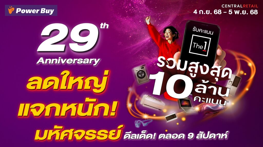 เตรียมส่งบิ๊กแคมเปญ “เพาเวอร์บาย 29 ปี มหัศจรรย์ดีลเด็ด ลดใหญ่จัดหนัก” ตลอด 9 สัปดาห์ ระหว่างวันที่ 4 ก.ย. – 5 พ.ย. 68 มอบสิทธิพิเศษมากมาย แจกคะแนน The 1 รวมกว่า 10 ล้านคะแนน เพื่อเป็นการขอบคุณลูกค้า