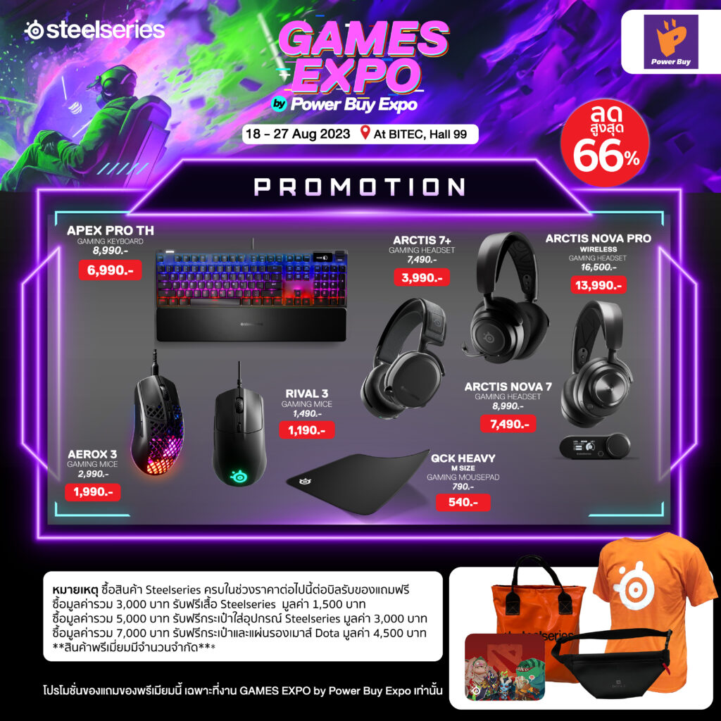 แล้วพบกับสินค้าเกมมิ่งเกียร์ราคาพิเศษ พร้อมกิจกรรมได้ที่บูธ SteelSeries ภายในงาน PowerBuy Game Expo มหกรรมเกมส์และอุปกรณ์เกมมิ่งและสินค้าไอทีแห่งปี ระหว่างวันที่ 18-27 สิงหาคม พ.ศ. 2566 ณ ศูนย์การประชุมไบเทค บางนา ฮอลล์ EH 99