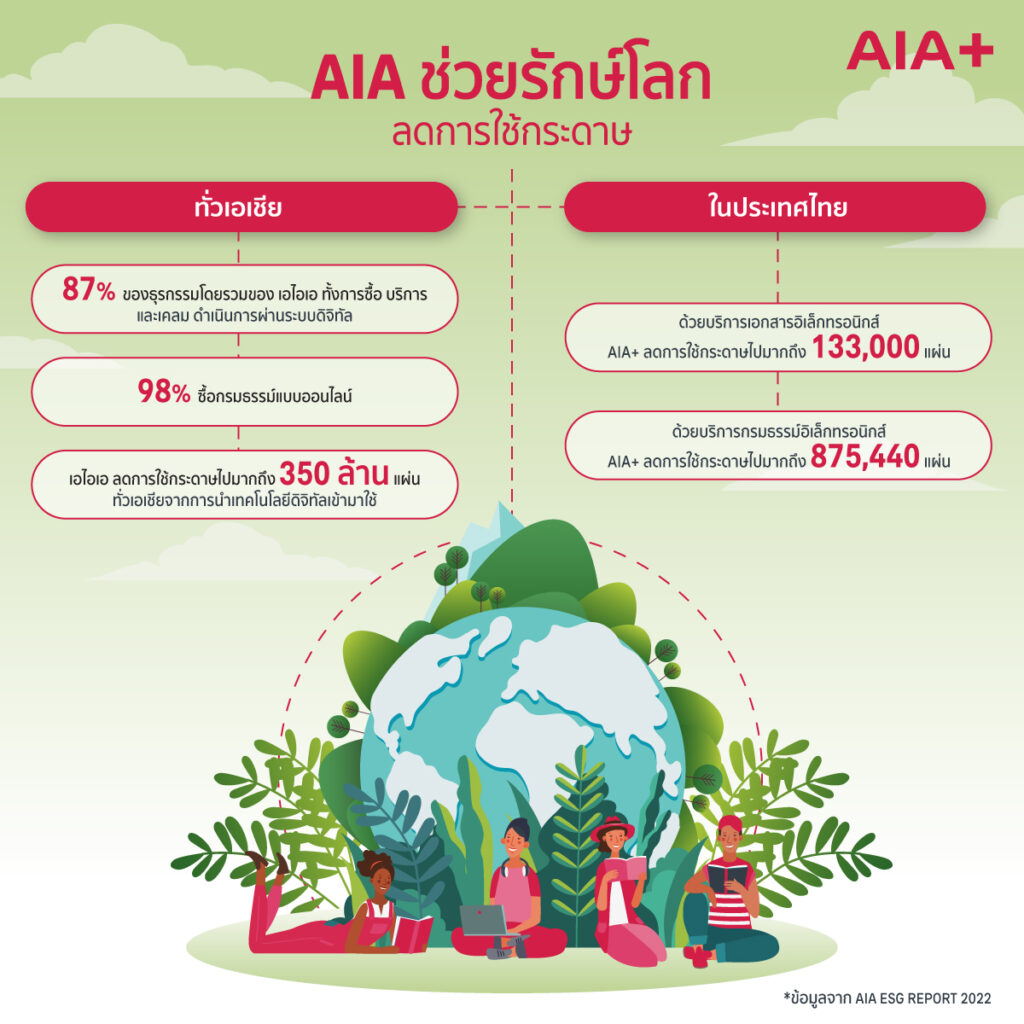 ในปี 2565 เอไอเอ ประเทศไทย สามารถลดปริมาณการใช้กระดาษลงได้ถึง 1,008,440 แผ่น ด้วยการสนับสนุนให้ลูกค้าลงทะเบียนใช้บริการเอกสารอิเล็กทรอนิกส์ (e-Document) และบริการกรมธรรม์อิเล็กทรอนิกส์ (e-Policy) โดยบริการเหล่านี้ได้เปิดตัวตั้งแต่ปี 2563 เพื่อช่วยให้ลูกค้าเอไอเอ เข้าถึงเอกสารกรมธรรม์ได้ง่ายผ่านแอปพลิเคชัน AIA+ อีกทั้ง เอไอเอ ประเทศไทย ยังได้ผสานเทคโนโลยี บริการดิจิทัล และการวิเคราะห์ความต้องการของลูกค้าไว้ในผลิตภัณฑ์ประกัน ตามเป้าหมายที่จะมอบประสบการณ์ที่ดีที่สุดแบบครบวงจรแก่ผู้ใช้งานผ่านแอปพลิเคชัน AIA+ ตลอดจนยังประสบความสำเร็จตามเป้าหมายในการสร้างการมีส่วนร่วมกับชุมชน และการตั้งเป้าเป็นผู้นำด้านในการดำเนินงานโครงการด้านสิ่งแวดล้อม ความรับผิดชอบต่อสังคม และธรรมาภิบาล โดยที่ผ่านมา เอไอเอ ได้มีโครงการที่ส่งเสริมด้าน ESG เช่น โครงการ AIA Saves the World และอีกหลายโครงการที่มุ่งส่งเสริมด้านการออกแบบและการใช้งานอาคารภายใต้คอนเซ็ปต์ Green Building ที่เป็นมิตรกับสิ่งแวดล้อม