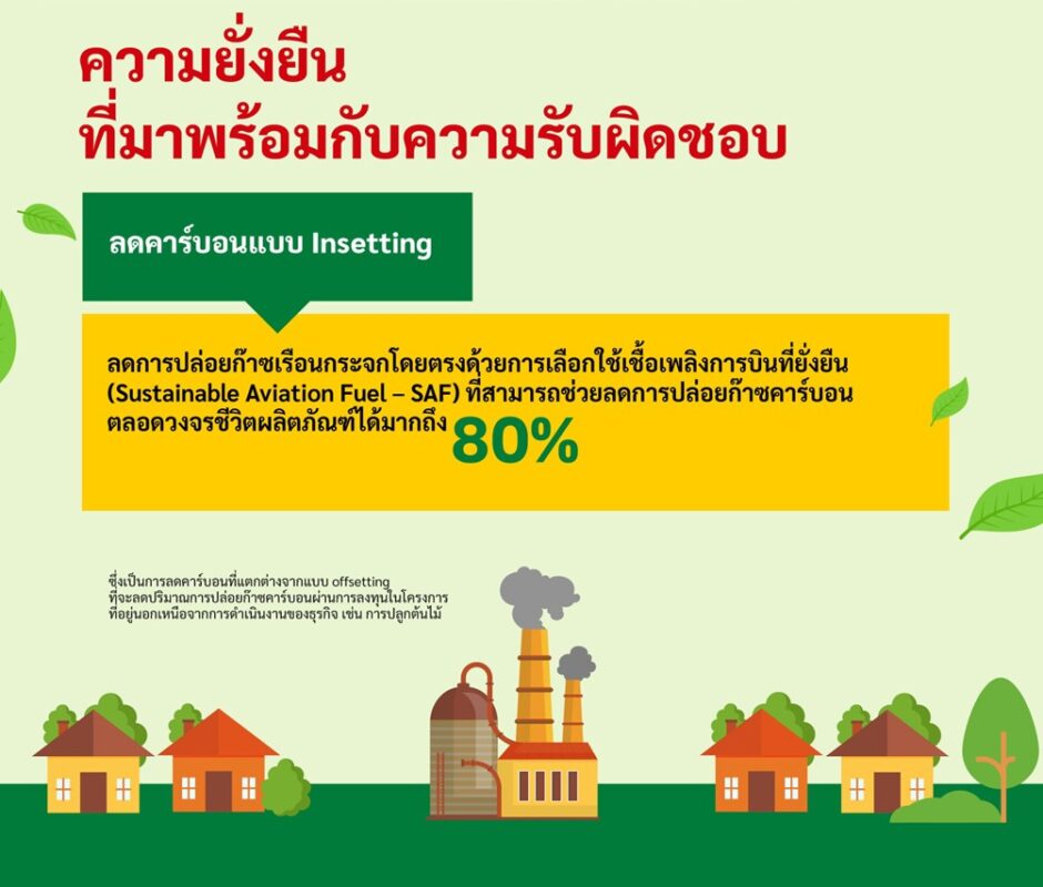 เชื้อเพลิงการบินที่ยั่งยืน (Sustainable Aviation Fuel – SAF) ถือเป็นทางออกที่เหมาะสมที่สุดในการลดการปล่อยก๊าซเรือนกระจกในภาคธุรกิจการบิน โดยเชื้อเพลิง SAF ผลิตจากทรัพยากร (feedstock) ที่หมุนเวียนและยั่งยืน เช่น น้ำมันปรุงอาหารที่ใช้แล้ว ไขมันสัตว์ และของเหลือทิ้งจากผลผลิตทางการเกษตร ซึ่งเชื้อเพลิง SAF เป็นหนึ่งในแหล่งพลังงานที่มีความเหมาะสมอย่างมากในการลดปริมาณก๊าซคาร์บอนในอุตสาหกรรมการบินจากความเป็นไปได้ในทางปฏิบัติและการสร้างอิมแพคต่อสิ่งแวดล้อม โดยจะช่วยลดการปล่อยก๊าซเรือนกระจกได้มากถึง 80% เมื่อเทียบกับเชื้อเพลิงเครื่องบินแบบเก่า ดังนั้นจึงนับเป็นเครื่องมือสำคัญในการรับมือกับการเปลี่ยนแปลงของสภาพภูมิอากาศ[1] สมาคมขนส่งทางอากาศระหว่างประเทศ (International Air Transport Association – IATA) ประมาณการว่า SAF จะช่วยลดการปล่อยก๊าซเรือนกระจกในอุตสาหกรรมการบินได้ถึง 65% ตามเป้าหมายการลดคาร์บอนสุทธิให้เหลือศูนย์ (Net Zero) ภายในปี 2593[2]