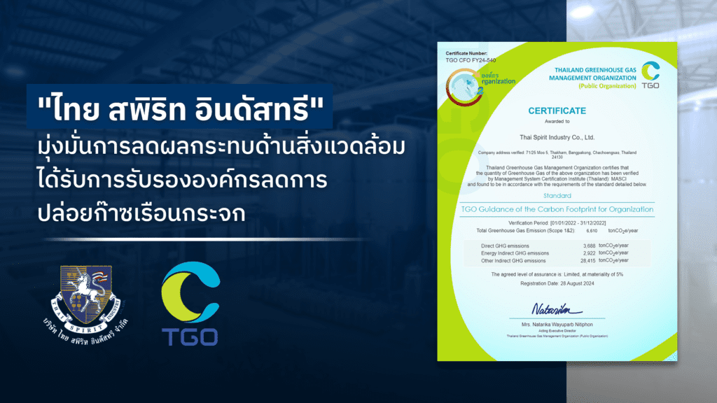 บริษัท ไทย สพิริท อินดัสทรี จำกัด หรือ “TSI” บริษัทที่ดำเนินธุรกิจด้านการผลิตและจัดจำหน่ายเครื่องดื่มในรูปแบบ RTD ผู้ที่มุ่งมั่นจะส่งเสริมอุตสาหกรรมเครื่องดื่มในประเทศไทยให้เทียบเท่าระดับสากล ภายใต้การกำกับและบริหารงานของหัวเรือใหญ่ คุณเทพอาจ กวินอนันต์ประธานเจ้าหน้าที่บริหาร ได้รับการรับรองจาก “Thailand Greenhouse Gas Management Organization” องค์กรที่ได้รับความเชื่อมั่นจากชาวไทยและสากลในการประเมินและรับรองผลการลดการปล่อยก๊าซเรือนกระจก ใน State 1: CFO CERTIFICATE ที่เป็นการรับรองที่ยืนยันถึงความเอาใจใส่ในการลดการปล่อยก๊าซเรือนกระจกและการจัดการคาร์บอนภายในองค์กร