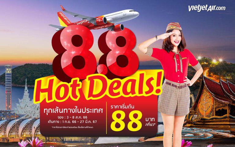 สายการบินไทยเวียตเจ็ทฉลองวันดับเบิลเดย์ประจำเดือนสิงหาคมด้วยโปรโมชั่น “8.8 Hot Deals” เสนอบัตรโดยสารราคาพิเศษ เริ่มต้นเพียง 88 บาท
