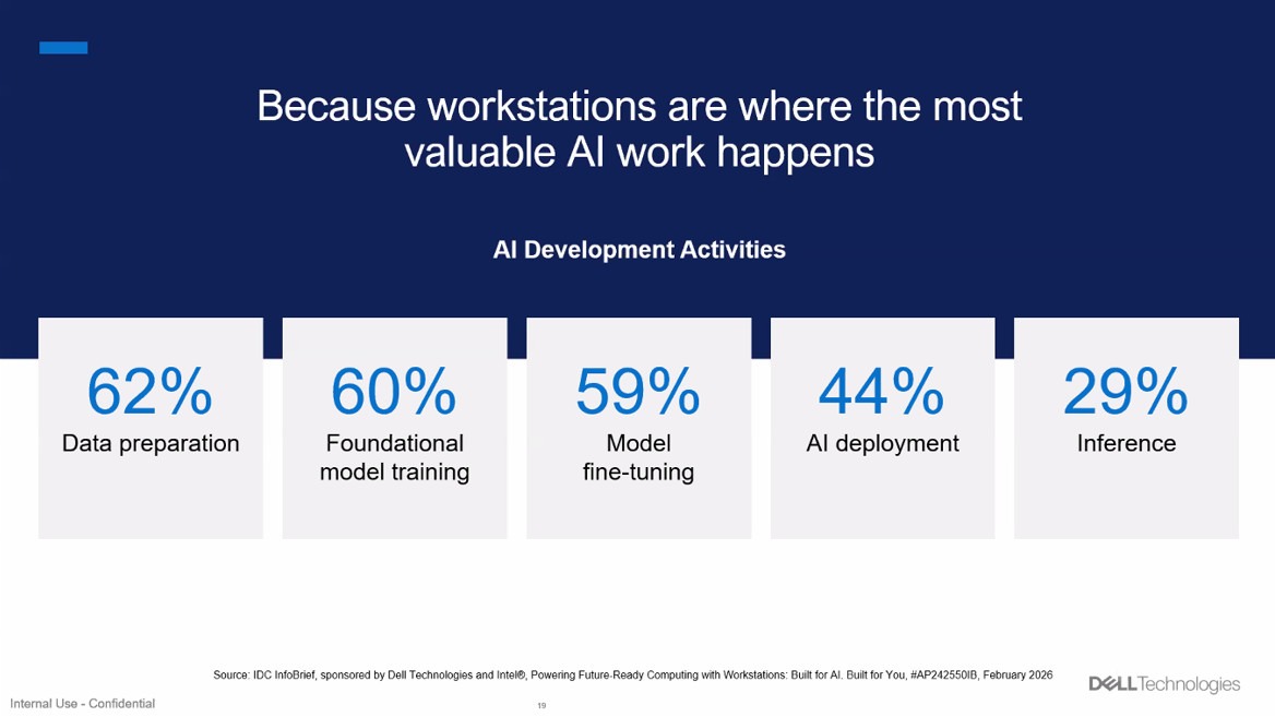 ขณะที่ AI PC กระจายศูนย์ความฉลาดครอบคลุมบุคลากรทั่วองค์กร เวิร์กสเตชันก็ยังคงทำหน้าที่เป็นแกนหลักด้านประสิทธิภาพสำหรับเวิร์กโหลดที่ต้องการประสิทธิภาพสูง โดยเฉพาะอย่างยิ่งเมื่อองค์กรหันมาพัฒนา AI บนระบบภายในองค์กรมากขึ้น โดยนักพัฒนา วิศวกร นักออกแบบ และทีมข้อมูล ต่างพึ่งพาระบบเวิร์กสเตชันสำหรับการพัฒนาโมเดล AI การจำลอง การเรนเดอร์ การเตรียมข้อมูล และงานอื่นๆที่ต้องใช้การประมวลอย่างหนัก ที่ต้องอาศัยทั้งความน่าเชื่อถือ ความหน่วงต่ำ และประสิทธิภาพที่ต่อเนื่อง