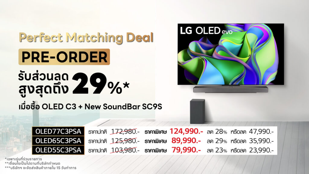 ซาวด์บาร์ LG SC9S ใหม่ ราคา 32,990 บาท และมาในโทนสีดำคลาสสิกเข้ากับทีวีแอลจีอย่างลงตัว พิเศษเฉพาะช่วงเปิดตัว!! พบข้อเสนอที่พลาดไม่ได้ เมื่อซื้อซาวด์บาร์ SC93 คู่กับทีวี LG OLED evo 4K ซีรีส์ C3 ขนาด 55, 65 หรือ 77 นิ้ว รับส่วนลดสูงสุด 47,990 บาท ตั้งแต่วันนี้ถึง 31 สิงหาคม 2566 เท่านั้น พร้อมจำหน่ายแล้วที่ร้านค้าทั่วประเทศ อาทิ เพาเวอร์บาย โฮมโปร เพาเวอร์มอลล์