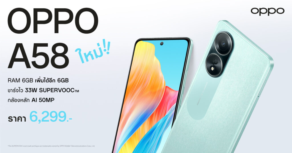ออปโป้ ไทยแลนด์ แบรนด์เทคโนโลยีชั้นนำระดับโลก วางจำหน่าย “OPPO A58” สมาร์ตโฟนรุ่นใหม่ล่าสุดจาก OPPO A Series อย่างเป็นทางการในประเทศไทย พร้อมให้คุณใช้งานได้เต็มพิกัด ทุกความบันเทิง ตอบโจทย์ทุกเอ็นเตอร์เทน ไม่ว่าจะดูหนัง ฟังเพลงหรือเล่นเกมก็ใช้งานได้อย่างลื่นไหลด้วย RAM 6GB เพิ่มหน่วยความจำได้อีก 6GB ใช้งานได้แบบไม่มีสะดุดด้วยชาร์จไว 33W SUPERVOOC ใช้งานได้ทั้งวันด้วยการชาร์จเพียง 75 นาที และแบตเตอรี่ใหญ่ 5,000mAh มาพร้อมลำโพงสเตอริโอคู่ โหมด Ultra Volume ช่วยเพิ่มระดับเสียงขึ้นถึง 300% เมื่อใช้ลำโพงโดยไม่ทำให้คุณภาพเสียงลดลง และมอบการรับชมที่เต็มอิ่มทุกอรรถรส เสริมความสมจริงด้วยหน้าจอกว้าง 6.72” คมชัด FHD+ สู้แสงด้วย Sunlight Display และสำหรับสายโซเชียลยังมาพร้อมกล้องหลัก AI 50MP ถ่ายภาพสวย สนุกทุกมุมด้วย อวดรูปสวยลงโซเชียลได้ทุกมุม นอกจากนี้ยังรับประกันการใช้งานลื่นไหลนานถึง 36 เดือน มอบประสบการณ์ใช้งานที่ราบรื่นยาวนาน