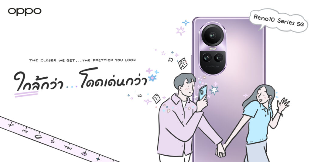 OPPO Reno10 Series 5G สานต่อพลังของ The Portrait Expert ด้วยการเป็นครั้งแรกของสมาร์ตโฟนราคาระดับกลางที่มา พร้อมกับ Telephoto Portrait Camera กล้องพอร์ตเทรตแบบซูมได้ ให้ภายถ่ายที่ใกล้กว่า โดดเด่นกว่า มอบประสบการณ์การถ่ายภาพพอร์ตเทรตสวยคมชัด เป็นธรรมชาติ และให้บุคคลในภาพโดดเด่นมีมิติใกล้กับวิวพื้นหลังมากขึ้น มาพร้อมดีไซน์ใหม่ สัมผัสพรีเมียม บางเฉียบแบบ 3D Dual – Curved โดยมาใน 3 รุ่นได้แก่ OPPO Reno10 5G มาในสีใหม่ สีฟ้า Ice Blue และ สีเทา Silvery Grey, OPPO Reno10 Pro 5G และ OPPO Reno10 Pro+ 5G มาใน 2 สี ได้แก่ สีม่วง Glossy Purple และ สีเทา Silvery Grey