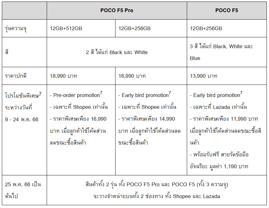 - Pre-order promotion7 สำหรับ POCO F5 Pro รุ่นความจุ 12GB+512GB ราคาพิเศษเมื่อลูกค้ากดใช้โค้ดส่วนลดขณะซื้อสินค้า เหลือเพียง 16,990 บาท (จากราคาปกติ 18,990 บาท)