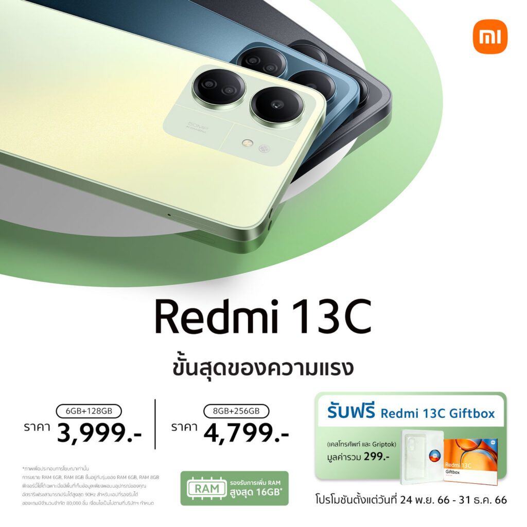 พิเศษ! สำหรับลูกค้าที่ซื้อ Redmi 13C ในระหว่างวันที่ 24 พฤศจิกายน 2566 ถึง 31 ธันวาคม 2566 รับฟรี Redmi 13C Giftbox มูลค่า 299 บาท