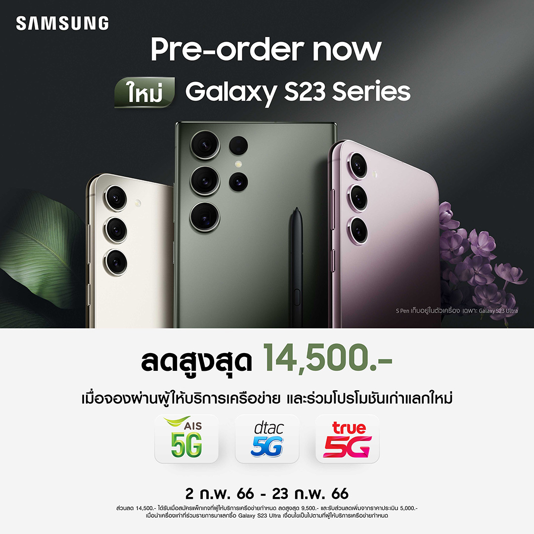 - เก่าแลกใหม่ ลดเพิ่มสูงสุด 5,000.-(ลดเพิ่มจากราคาประเมิน 5,000.- เมื่อซื้อ Galaxy S23