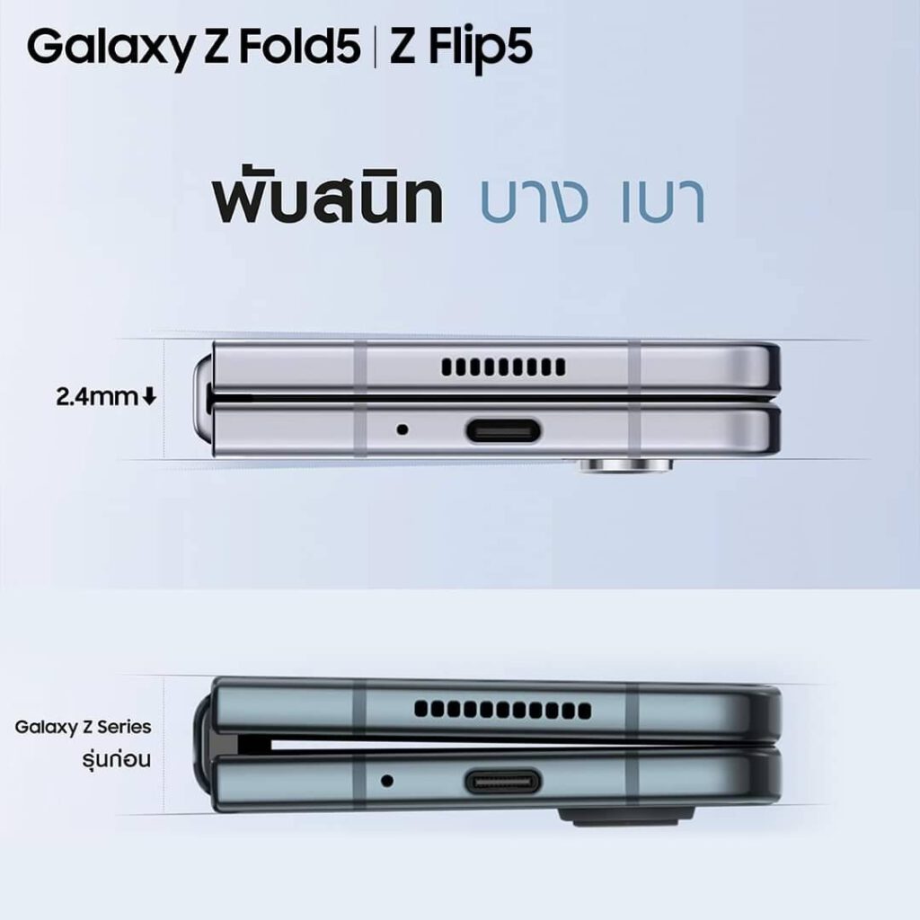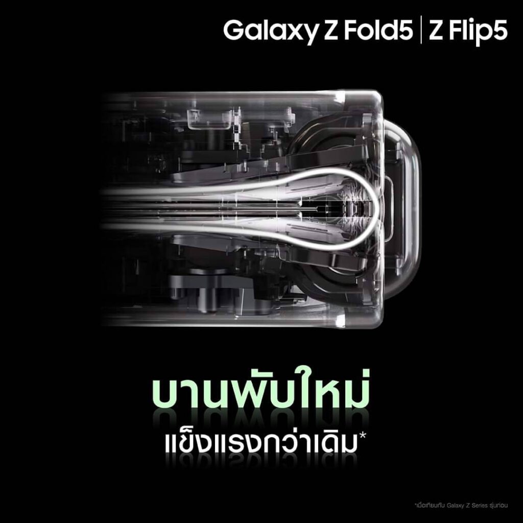 ทั้ง 2 รุ่นได้อัปเกรดดีไซน์ใหม่ ด้วยการเปลี่ยนมาใช้บานพับที่เรียกว่า Flex Hinge ซึ่งช่วยให้หน้าพับสามารถประกบกันได้แนบสนิทกว่ารุ่นก่อนๆ ทำให้ความบางของตัวเครื่องลดลงอีกด้วย ในรุ่น Galaxy Z Flip จากเดิม 15.9 มม. บนรุ่นนี้เหลือบางแค่ 15.1 มม.เท่านั้น พกติดกระเป๋าใบเล็กจิ๋วได้ง่ายๆ ส่วน Galaxy Z Fold5 เมื่อพับจอแล้วจะมีความบางเพียง 13.4 มม. และทั้ง 2 รุ่นถึงแม้ว่าบางลงแล้วแต่ความแข็งแรงไม่น้อยลงไปเลย เพราะเฟรมเครื่องทำจากโลหะ Armor Aluminum ที่มีความทนทานสูง