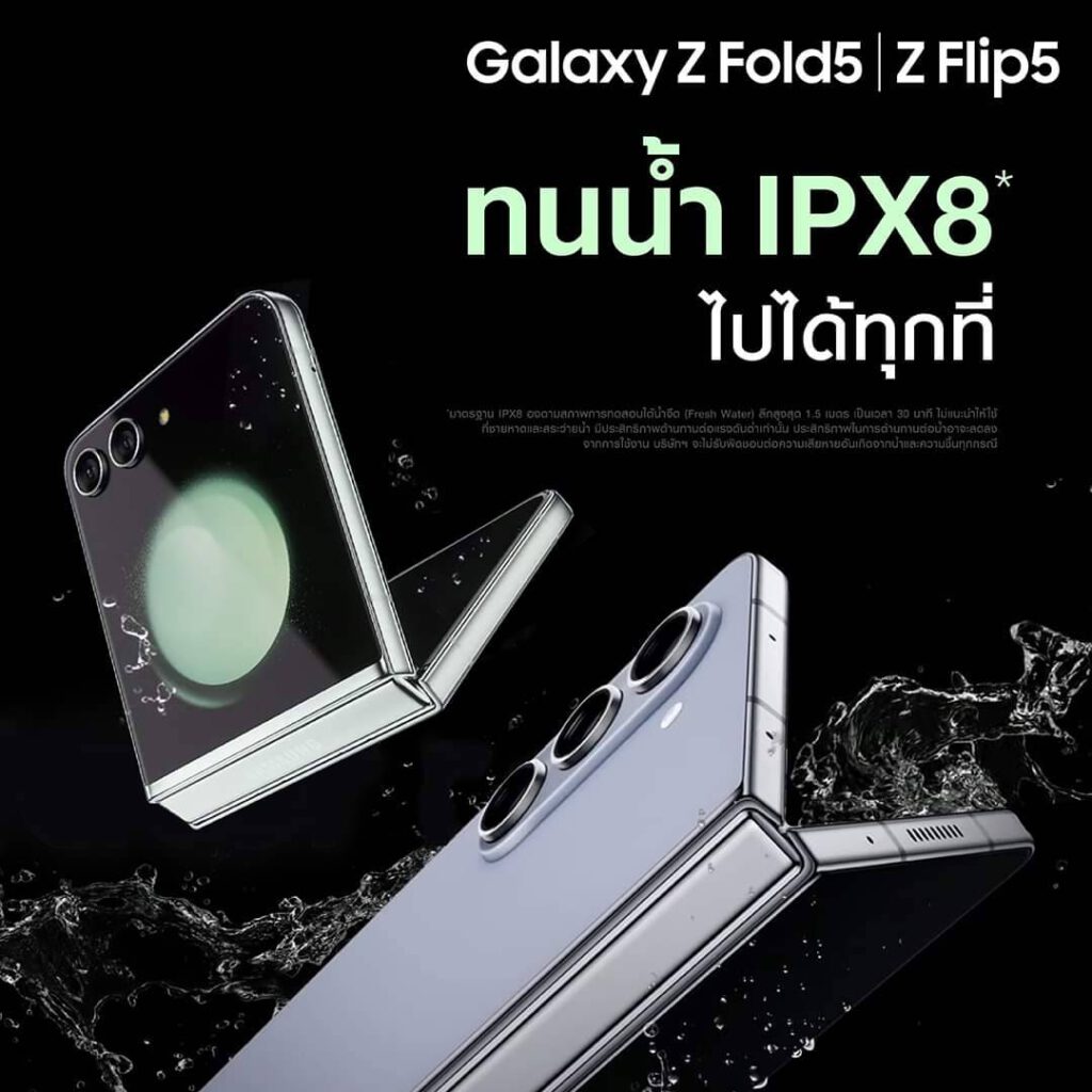 ถึงแม้ว่าจะเป็นมือถือจอพับ แต่ไม่ได้บอบบางอย่างที่คิดนะ! เพราะ Galaxy Z Flip5 และ Galaxy Z Fold5 ได้การรองรับมาตรฐาน IPX8 ซึ่งสามารถลงน้ำลึกได้ 1.5 เมตร เป็นเวลา 30 นาที สามารถใช้งานได้อุ่นใจหายห่วงไม่ต้องกลัวน้ำหกใส่และไม่ต้องกลัวฝนอีกต่อไป