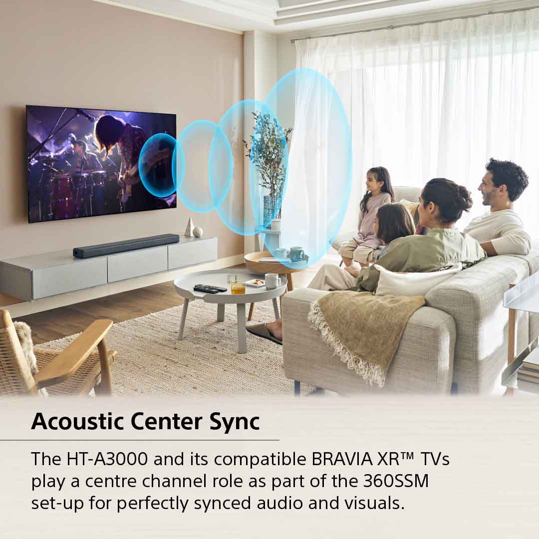 ยิ่งไปกว่านั้น HT-A3000 ยังสามารถจับคู่กับทีวี BRAVIA XR ที่เข้ากันได้ เพื่อช่วยยกระดับประสบการณ์การรับชมภาพยนตร์ในบ้านให้ดียิ่งขึ้น พร้อมมอบประสบการณ์ภาพและเสียงที่ดื่มด่ำที่สุด ด้วยคุณภาพของภาพและเสียงที่ดีที่สุดของโซนี่ เมื่อทำงานร่วมกับฟังก์ชั่น Acoustic Center Sync จะทำให้ HT-A3000 และ BRAVIA XR TV กลายเป็นลำโพงกลางในระบบโฮมเธียเตอร์ ซึ่งช่วยให้เสียงตรงกับสิ่งที่อยู่บนหน้าจอได้อย่างแม่นยำ คุณจะได้ยินเสียงสนทนาจากตำแหน่งที่ตัวละครยืนอยู่ในฉากได้อย่างชัดเจน อีกทั้งยังทำงานร่วมกับการตั้งค่า 360 Spatial Sound Mapping เพื่อมอบประสบการณ์การรับชมที่ชวนดื่มด่ำยิ่งกว่าที่เคยอีกด้วย
