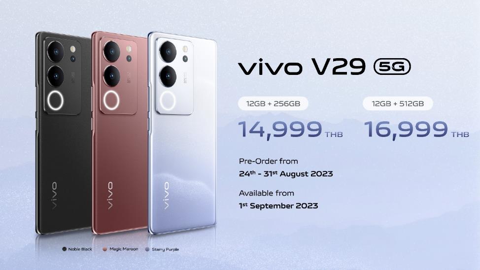 แฟน ๆ vivo ในไทยเตรียมสัมผัสความหรูหราเหนือระดับและประสบการณ์การใช้งานที่รอบด้านไปกับ vivo V29 5G อย่างเป็นทางการ ได้ตั้งแต่วันที่ 1 กันยายน 2566 เป็นต้นไป โดยมีให้เลือกทั้งหมด 2 รุ่น ได้แก่ รุ่น 12GB + 256GB ในราคา 14,999 บาท และรุ่น 12GB + 512GB ในราคา 16,999 บาท พิเศษก่อนใคร vivo V29 5G เปิดให้จับจอง ตั้งแต่วันที่ 24 สิงหาคม – 31 สิงหาคม 2566 พร้อมรับของสมนาคุณสุดเอ็กซ์คลูซีฟสำหรับลูกค้าพรีออเดอร์มูลค่ารวมสูงสุด 11,797 บาท โดยประกอบด้วย