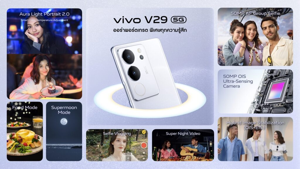 vivo แบรนด์สมาร์ตโฟนชั้นนำระดับโลก เปิดตัว vivo V29 5G สมาร์ตโฟนรุ่นล่าสุดจากตระกูล V Series อย่างเป็นทางการ ให้แฟน ๆ ในไทยได้สัมผัสนวัตกรรมสมาร์ตโฟนที่เหนือชั้นไปอีกขั้น ภายใต้แนวคิด “ออร่าพอร์ตเทรต พิเศษทุกความรู้สึก” ที่ยังคงมาพร้อมเทคโนโลยี Aura Light Portrait System ระดับเรือธง โดดเด่นด้วยฟีเจอร์ถ่ายภาพขั้นเทพอย่างแสงออร่าพอร์เทรต Aura Light Portrait 2.0 ที่อัปเกรดใหม่ พร้อมฟีเจอร์ปรับสีภาพถ่ายอัจฉริยะ Smart Color Temperature Adjustment ให้สาวก vivo เก็บทุกภาพความทรงจำและเฉลิมฉลองทุกช่วงเวลาสุดพิเศษในทุกโมเมนต์ อัดแน่นไปด้วยประสิทธิภาพการทำงานที่ทรงพลัง ในดีไซน์ใหม่ที่เปี่ยมด้วยสุนทรียภาพแห่งการออกแบบ พร้อมเปิดมิติใหม่แห่งวงการสมาร์ตโฟน ครบครันด้วยฟีเจอร์ล้ำสมัยที่ผสานพลังเทคโนโลยีขั้นสูง ให้ผู้ใช้งานสัมผัสประสบการณ์เหนือระดับ และตอบโจทย์ทุกความท้าทาย