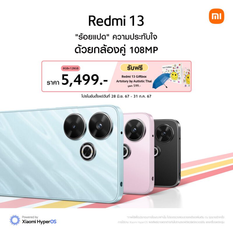 Redmi 13 ความจุ 8GB+128GB มีให้เลือก 3 สี ได้แก่ Midnight Black, Ocean Blue และ Pearl Pink วางจำหน่ายในราคา 5,499 บาท ที่ Xiaomi Store และร้านตัวแทนจำหน่ายที่ร่วมรายการทั่วประเทศ รวมถึงช่องทางออนไลน์ โดยจะวางจำหน่ายในประเทศไทยอย่างเป็นทางการในวันที่ 28 มิถุนายน 2567 เป็นต้นไป พิเศษ! สำหรับลูกค้าที่ซื้อ Redmi 13 ในระหว่างวันที่ 28 มิถุนายน – 31 กรกฎาคม 2567 รับฟรี! Redmi 13 Giftbox Artstory by Autistic Thai มูลค่า 599 บาท12