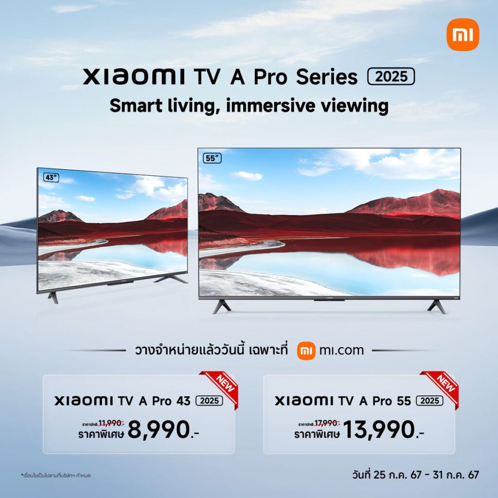 เสียวหมี่ ประเทศไทย พร้อมมอบประสบการณ์การรับชมสุดดื่มด่ำครั้งใหม่ ประกาศวางจำหน่ายทีวีอัจฉริยะรุ่น ‘Xiaomi TV A Pro Series 2025’ ซึ่งมีให้เลือก 2 ขนาด คือ Xiaomi TV A Pro 55 2025 (ขนาด 55 นิ้ว) และ Xiaomi TV A Pro 43 2025 (ขนาด 43 นิ้ว) ภายใต้คอนเซ็ปต์ Smart living, immersive viewing กับหน้าจอสีสันคมชัดแบบ 4K QLED พร้อมตัวกรอบเมทัลลิกสุดพรีเมี่ยมที่ออกแบบมาอย่างบางเฉียบ โดย Xiaomi TV A Pro Series 2025 ทั้งสองรุ่นพร้อมให้คุณเป็นเจ้าของก่อนใครผ่านช่องทางการจำหน่าย mi.com ในระหว่างวันที่ 25 – 31 กรกฎาคม 2567 ในราคาพิเศษ1 โดย Xiaomi TV A Pro 55 2025 (ขนาด 55 นิ้ว) วางจำหน่ายในราคาพิเศษเพียง 13,990 บาท (จากราคาปกติ 17,990 บาท) พร้อมด้วย Xiaomi TV A Pro 43 2025 (ขนาด 43 นิ้ว) วางจำหน่ายในราคาพิเศษเพียง 8,990 บาท (จากราคาปกติ 11,990 บาท) และ Xiaomi TV A Pro Series 2025 ทั้งสองรุ่นจะวางจำหน่ายอย่างเป็นทางการทั่วประเทศที่ Xiaomi Store, ร้านตัวแทนจำหน่ายที่ร่วมรายการ และช่องทางออนไลน์ตั้งแต่วันที่ 16 สิงหาคมเป็นต้นไป