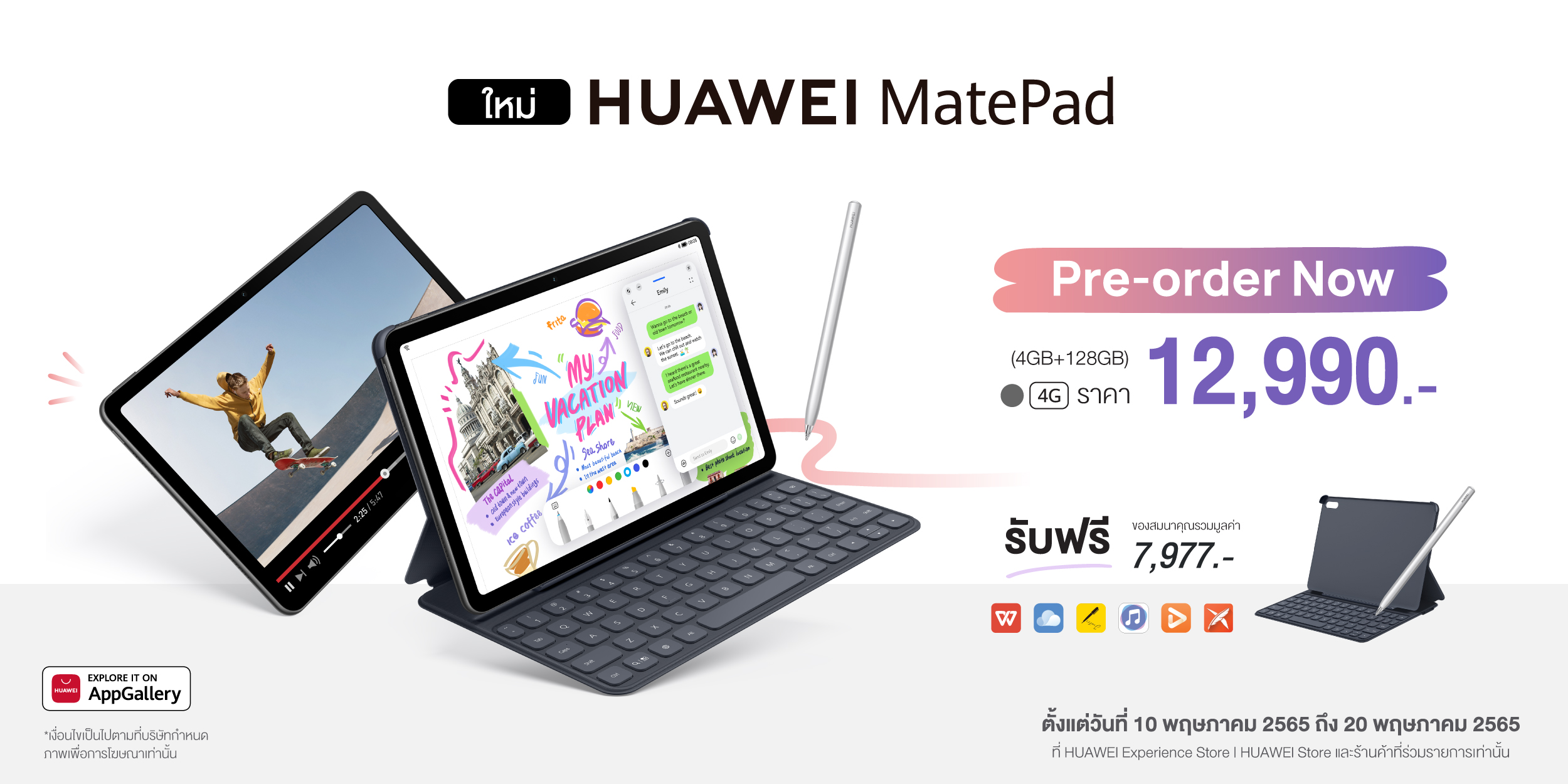 HUAWEI MatePad 10.4-inch 2022 (4GB+128GB) 4G จะวางจำหน่ายในสี Matte Grey ราคา 12,990 บาท โดยพรีออเดอร์ได้ตั้งแต่วันที่ 10 พฤษภาคม 2565 – 20 พฤษภาคม 2565 รับทันที HUAWEI Smart Keyboard (มูลค่า 2,290 บาท) และ HUAWEI M-Pencil Package 2nd generation (มูลค่า 4,490 บาท) และสิทธิประโยชน์อีกมากมาย สำหรับลูกค้า HUAWEI Mobile Service และแอปพลิเคชันต่างๆ (มูลค่ารวม 1,197 บาท) รวมมูลค่าทั้งหมด 7,977 บาท สามารถสั่งจองได้ผ่านหน้าร้าน HUAWEI Experience Store และร้านค้าตัวแทนจำหน่ายที่ร่