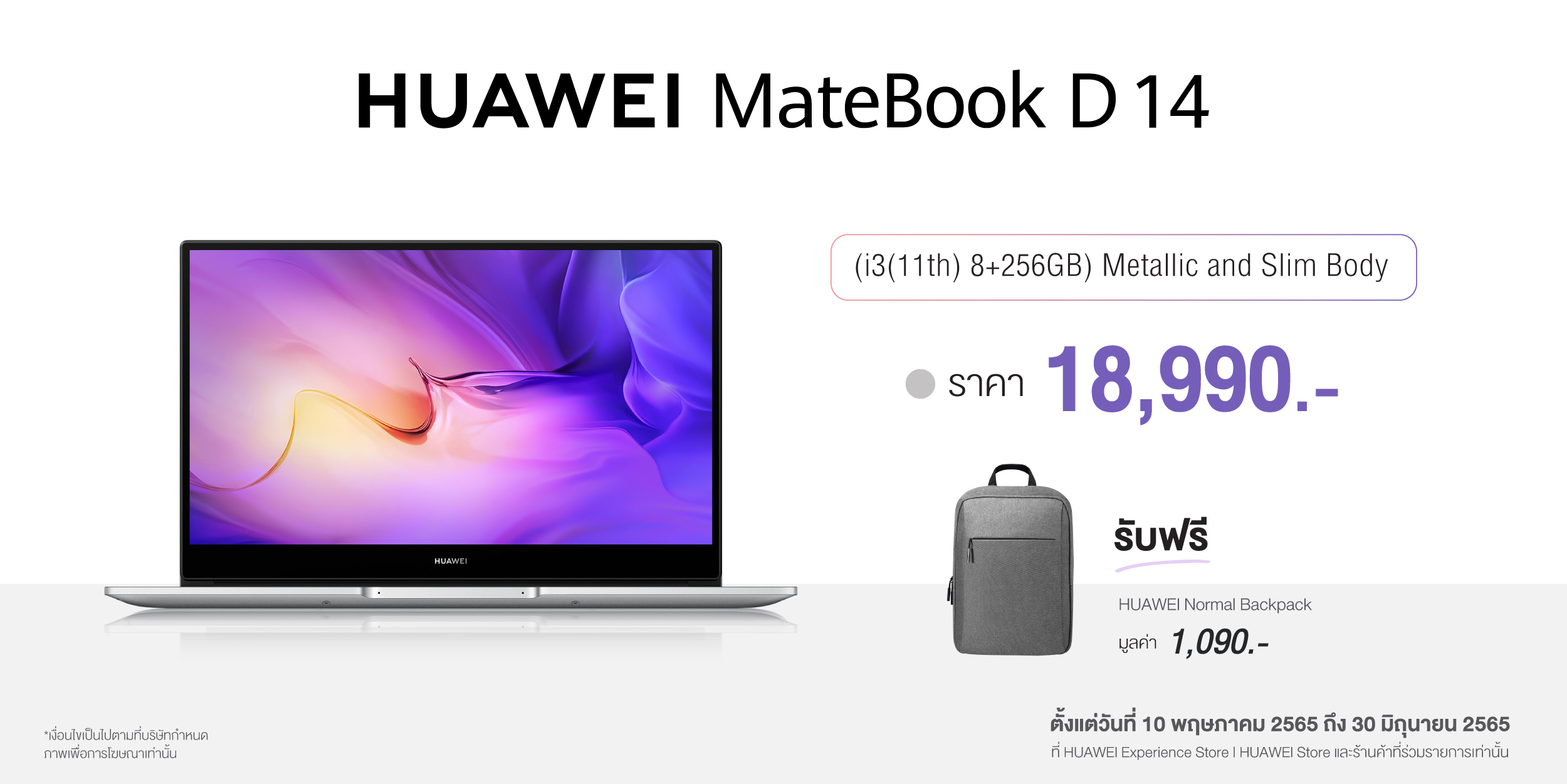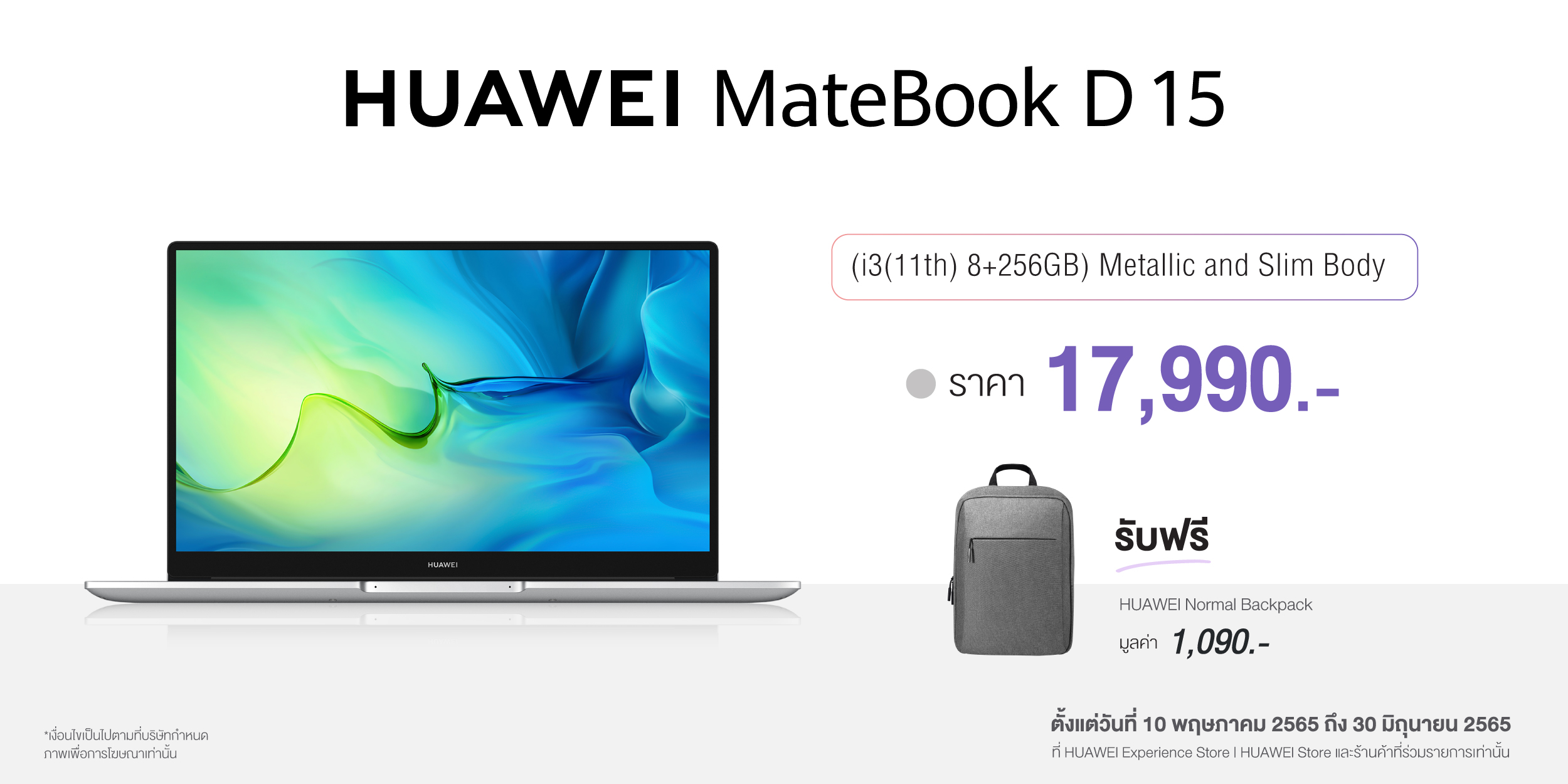 HUAWEI MateBook Family สามารถสั่งซื้อได้ตั้งแต่วันที่ 10 พฤษภาคม 2565 เป็นต้นไป รับฟรีทันทีกระเป๋าเป้สะพายหลัง HUAWEI Normal Backpack มูลค่า 1,090 บาท โดยวางจำหน่ายรุ่นต่างๆ ดังนี้