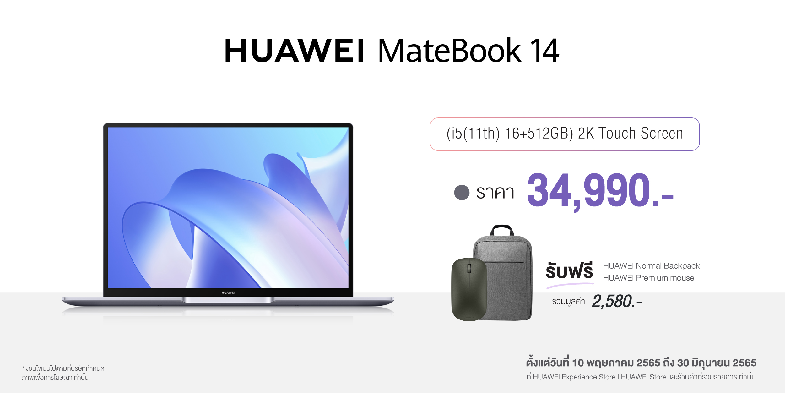 - HUAWEI MateBook 14 11th Gen Intel® Core™ i5 (16GB+512GB) หน้าจอทัชสกรีน สี Space Grey ราคา 34,990 บาท รับฟรีของสมนาคุณพิเศษได้แก่ HUAWEI Normal Backpack และ HUAWEI Premium Mouse รวมมูลค่า 2,580 บาท