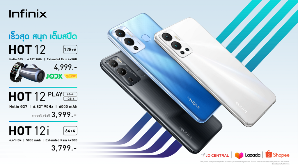 อินฟินิกซ์ (Infinix) แบรนด์สมาร์ตโฟนระดับโลกที่ประสบความสำเร็จและได้รับความนิยมเป็นอย่างมากทั้งในต่างประเทศและประเทศไทย เปิดตัวเกมมิ่งสมาร์ตโฟนราคาประหยัดใหม่ล่าสุด Infinix HOT 12 Series ที่มาพร้อมกับสโลแกน “Fast and Fun – เร็วสุด สนุกเต็มสปีด” พร้อมจับมือกับ JOOX Thailand แอปพลิเคชันฟังเพลงออนไลน์สุดฮิต จัดกิจกรรมสุดพิเศษมอบโค้ด VIP 90 วัน และของรางวัลมากมายเอาใจผู้ใช้งาน โดยสมาร์ตโฟนรุ่นท็อปอย่าง HOT 12 ชูจุดเด่นเอาใจผู้ใช้งานด้วยการเพิ่มหน่วยพื้นที่ความจำแบบจุใจ 128 GB พร้อมแรม 6+5 GB รวมสูงสุดได้ถึง 11 GB ผสานกับชิปเซต MediaTek Helio G85 หน้าจอขนาดใหญ่ 6.82 นิ้ว HD+ พร้อมรีเฟรชเรท 90Hz เพื่อตอบโจทย์การเล่นเกมที่ดีที่สุด และมอบประสบการณ์การรับชมความบันเทิงรูปแบบต่างๆ ได้ครบครันที่สุด ในราคาสุดคุ้ม 4,999 บาท