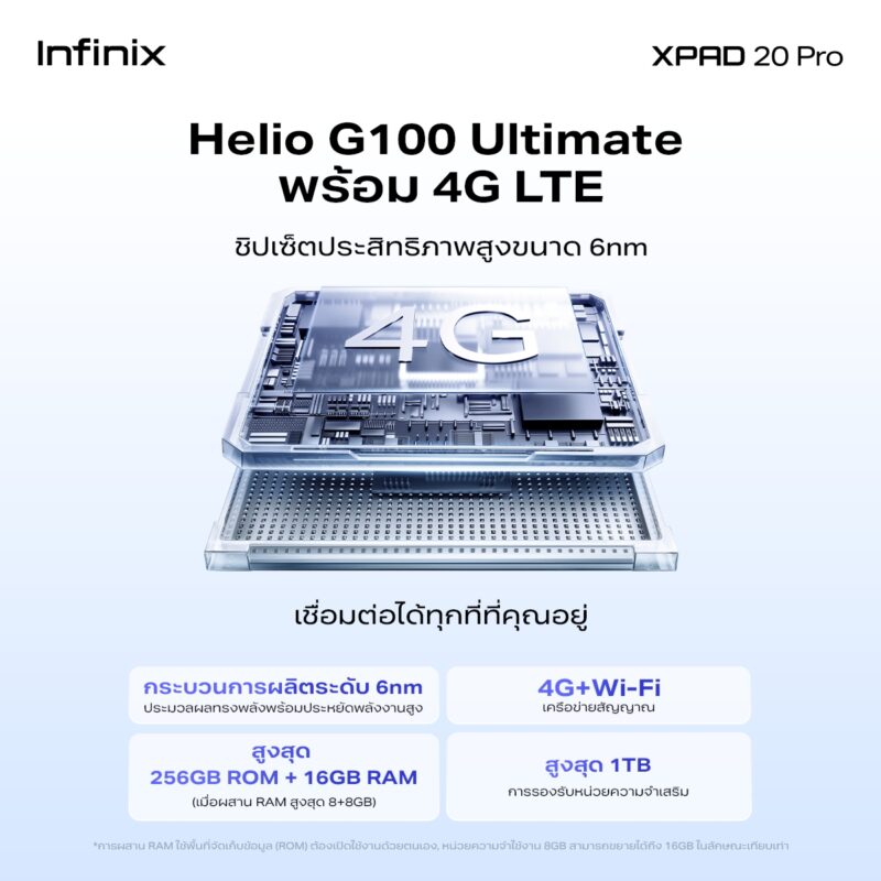 Infinix XPAD 20 Pro ขับเคลื่อนด้วยชิปเซ็ต MediaTek Helio G100 Ultimate ที่เน้นการประหยัดพลังงาน พร้อมรองรับ เครือข่าย 4G LTE ทำให้เชื่อมต่อได้ทุกที่โดยไม่ต้องพึ่ง WiFi หรือสิ้นเปลืองเน็ตจากโทรศัพท์มือถือพร้อมหน่วยความจำ RAM สูงสุด 16GB (เมื่อผสาน RAM) และความจุ ROM 256GB เพิ่ม MicroSD ได้ถึง 1TB เก็บไฟล์งานหรือเอกสาร ครบถ้วนไม่พลาดทุกข้อมูลสำคัญ อีกทั้งยังสามารถเปิดหลายแอปพลิเคชั่นพร้อมกันได้อย่างลื่นไหล ด้านการใช้งานที่ยาวนานมากพร้อมแบตเตอรี่ขนาดใหญ่ 8000mAh และรองรับระบบชาร์จไว 33W ทำให้ผู้ใช้มั่นใจได้ว่า Infinix XPAD 20 Pro จะพร้อมใช้งานอยู่เสมอ