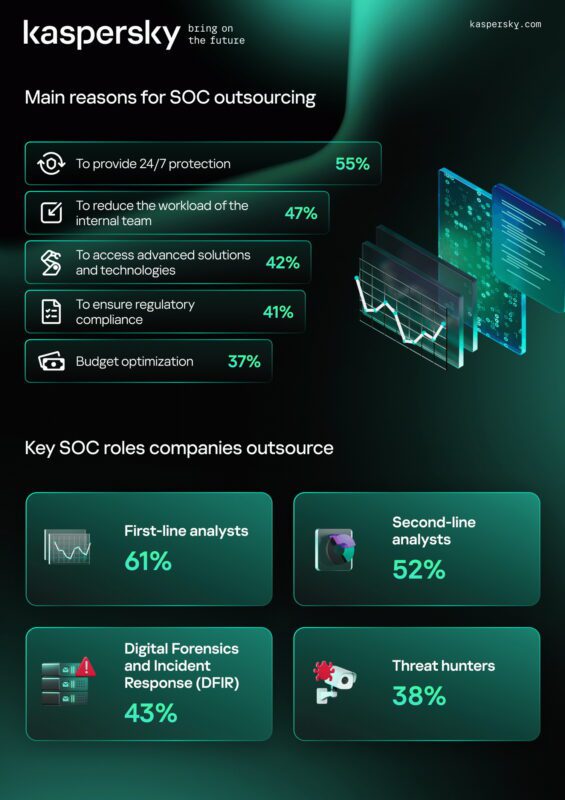 การวิจัยของแคสเปอร์สกี้ พบว่า บริษัทส่วนใหญ่เลือกที่จะเอาต์ซอร์สศูนย์ปฏิบัติการด้านความปลอดภัยหรือศูนย์ SOC บางส่วน โดยมีจำนวนมากที่เลือกใช้ SOC-as-a-Service (SOCaaS) การเคลื่อนไหวเชิงกลยุทธ์นี้ช่วยให้องค์กรได้รับประโยชน์จากการป้องกันตลอด 24 ชั่วโมง สามารถปฏิบัติตามมาตรฐานข้อบังคับ และใช้ประโยชน์จากโซลูชันด้านความปลอดภัยทางไซเบอร์ขั้นสูงและความเชี่ยวชาญที่มีคุณสมบัติเหมาะสม ซึ่งมักอยู่นอกเหนือขีดความสามารถภายในขององค์กร