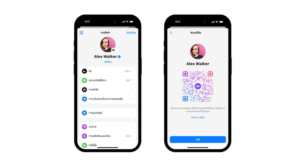 ผู้ใช้สามารถให้อีกฝ่ายเพิ่มเป็นเพื่อนทาง Messenger ได้ง่าย ๆ โดยไปที่การตั้งค่าและกดเลือกไอคอน QR code ด้านบน จากนั้นให้เพื่อนสแกน QR code ด้วยกล้องถ่ายภาพบนมือถือ หรือส่งลิงก์ให้อีกฝ่ายโดยการกด ‘แบ่งปัน’ (Share)