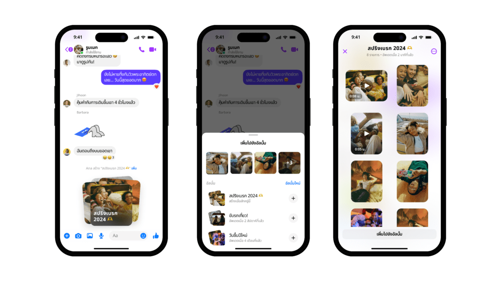 ผู้ใช้สามารถสร้างอัลบั้มภาพหรือวิดีโอได้จากในกลุ่มแชทโดยตรง ไม่ว่าจะเป็นภาพความประทับใจจากทริปการเดินทางช่วงสงกรานต์ในช่วงปีที่ผ่านมา หรือโมเมนต์ฉลองวันเกิดของคนในครอบครัว ก็สามารถเก็บช่วงเวลาเหล่านี้ไว้ในอัลบั้มในกลุ่มแชทได้โดยตรง เพื่อความสะดวกในการแชร์ จัดระเบียบ และเก็บภาพเหล่านี้ไว้เป็นความทรงจำ