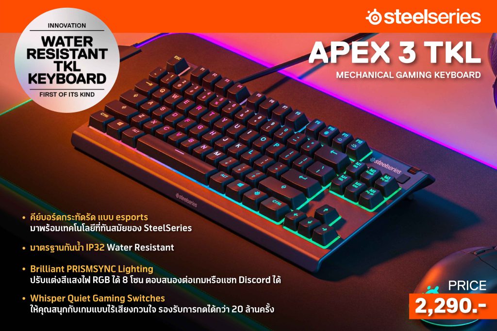 โดยคีย์บอร์ด APEX 3 TKL โดดเด่นด้วยดีไซน์แบบ TKL (TenkeyLess) พร้อมการออกแบบให้มีไฟ RGB แบบ 8 โซนที่ปรับแต่งได้ สามารถตอบสนองต่อเกมหรือข้อความจาก Discord ได้เป็นอย่างดี ในขณะที่ยังให้คุณสนุกกับการเล่นเกมแบบไร้เสียงกวนใจ ทั้งยังมาพร้อมสวิตซ์เกมแบบ Whisper Quiet ที่ได้รับการออกแบบด้วยวัสดุที่ทนทานต่อแรงเสียดทานและสามารถรองรับการคลิกแบบเงียบได้มากถึง 20 ล้านครั้ง รวมถึงการควบคุมมัลติมีเดียโดยเฉพาะสำหรับปรับเสียงและสื่อสามารถทำได้อย่างง่ายดาย ด้วยลูกกลิ้งโลหะสำหรับปรับระดับเสียงและปุ่มลัดที่ช่วยให้คุณปรับการตั้งค่าระดับเสียงและการใช้งานได้ทันที ทั้งนี้ยังช่วยให้คุณปรับความสว่าง กรอกลับ ข้าม หรือหยุดชั่วคราวด้วยการกดปุ่มเพียงปุ่มเดียว ยิ่งไปกว่านั้นโครงสร้างบริเวณด้านหลังคีย์บอร์ดจะมี 3 ช่อง ในการสำหรับ ล็อคสายเคเบิลในรูปแบบต่างๆ เพื่อเก็บสายบนโต๊ะได้อย่างสวยงามเรียบร้อย พร้อมเนรมิตโต๊ะคอมของคุณให้เป็นระเบียบเรียบร้อย อีกทั้งยังมาพร้อมระบบป้องกันแป้นพิมพ์ปุ่มตกหล่นแม้จะกดหลายปุ่มพร้อมกันก็ตาม ขณะเดียวกันปุ่มกดคีย์บอร์ดยังได้รับการออกแบบมาเป็นอย่างดีโดยผลิตจากวัสดุที่แข็งแรงและทนทานเป็นพิเศษ ยังมาพร้อมมาตรฐานกันน้ำกันฝุ่นได้ระดับ IP32 ป้องกันความเสียหายจากของเหลวและเครื่องดื่มหกใส่โดยไม่ได้ตั้งใจอีกด้วย โดย APEX 3 TKL วางจำหน่ายในราคา 2,290 บาท