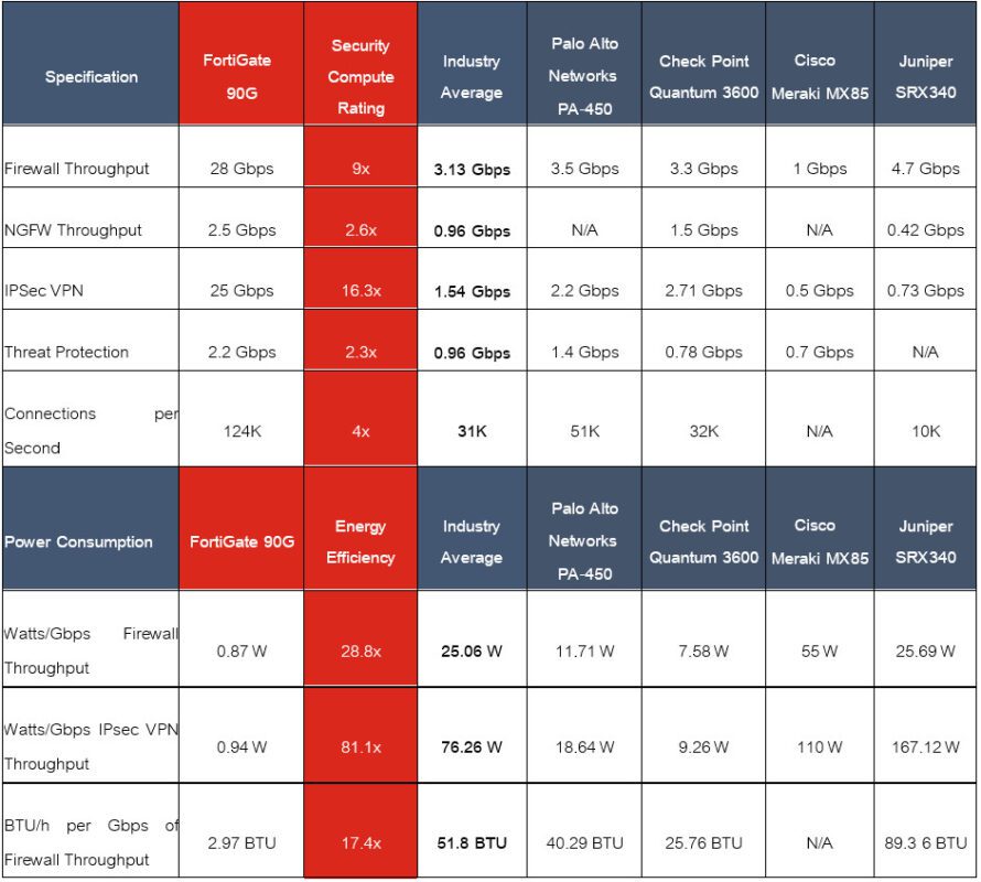 ทั้งนี้ ชุดไฟร์วอลล์ใหม่ คือชุดแรกที่มาพร้อมกับ SP5 ASIC ซึ่งเป็นเทคโนโลยี ASIC รุ่นที่ 5 ของฟอร์ติเน็ต ที่ประกาศเปิดตัวไปในช่วงต้นปี โดยให้ความสามารถในการเร่งความเร็วและเรียกใช้แอปพลิเคชันพร้อมกันได้มากกว่า 2 ตัวขึ้นไป ตัวอย่างเช่น เน็กซ์-เจนไฟร์วอลล์ (NGFW) เทคโนโลยี ZTNA (Zero-Trust Network Access) SD-WAN และการตรวจสอบ SSL ซึ่งเมื่อเปรียบเทียบกับรุ่นก่อนหน้า พลังของ FortiGate 90G พร้อมด้วย SP5 ASIC ของฟอร์ติเน็ต และ FortiGuard AI-Powered Security Services ให้ความสามารถที่เหนือชั้น ในการเปรียบเทียบจากตารางSecurity Compute Rating ด้านล่าง ที่เป็นเกณฑ์การเปรียบเทียบประสิทธิภาพไฟร์วอลล์ชั้นนำในตลาดของ FortiGate 90G ซีรีส์
