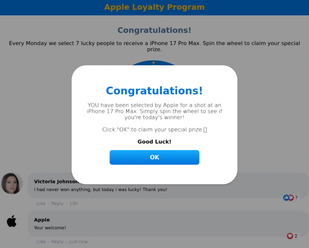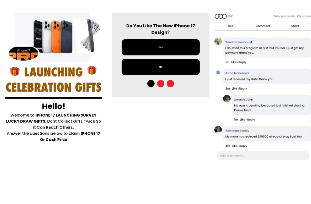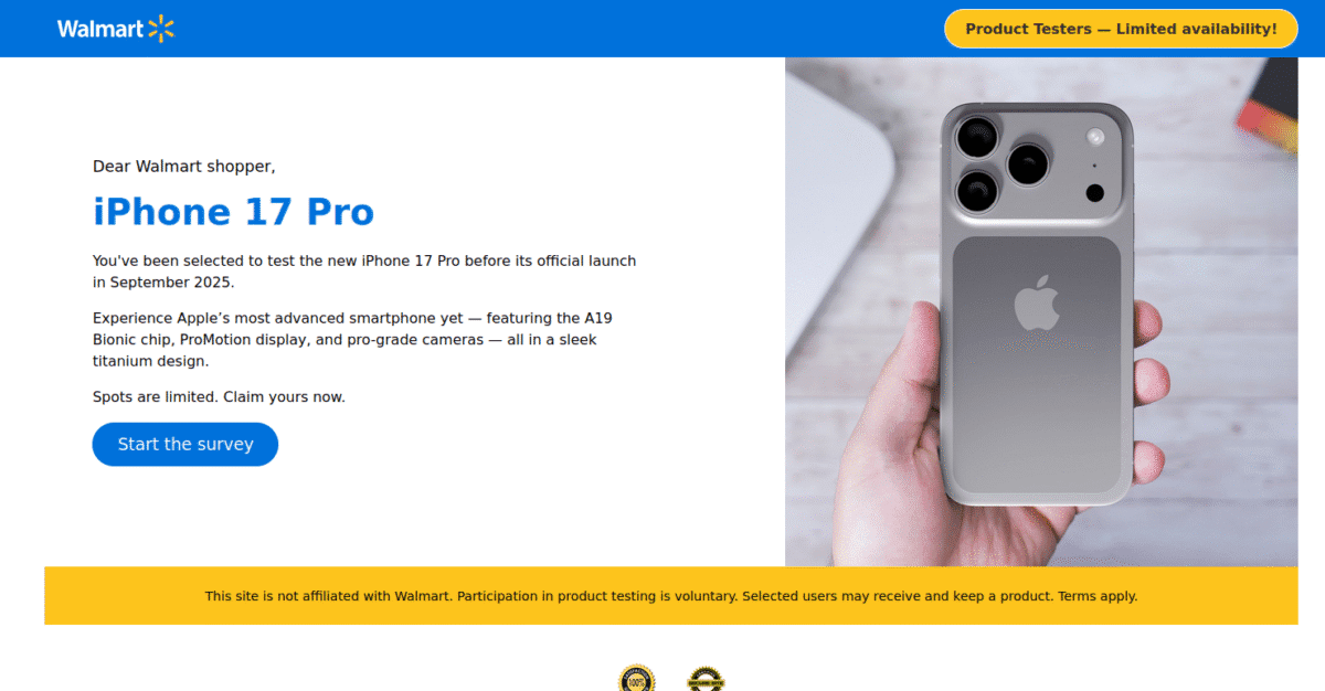 นอกจากนี้ พวกมิจฉาชีพยังโฆษณาเปิดโอกาสให้ผู้สนใจได้สมัครทดลองใช้ iPhone 17 เพื่อล่อใจผู้ใช้ที่เชี่ยวชาญด้านเทคโนโลยีให้รายละเอียดการติดต่อและที่อยู่จัดส่ง รวมถึงจ่ายค่าธรรมเนียมการจัดส่ง เพื่อแลกกับการทดลองใช้งานก่อนใคร แต่สุดท้ายแล้วก็ไม่มีการจัดส่ง อีกทั้งยังทำให้เกิดสแปมมากเกินไปและการติดตามฟิชชิงแบบเจาะจง