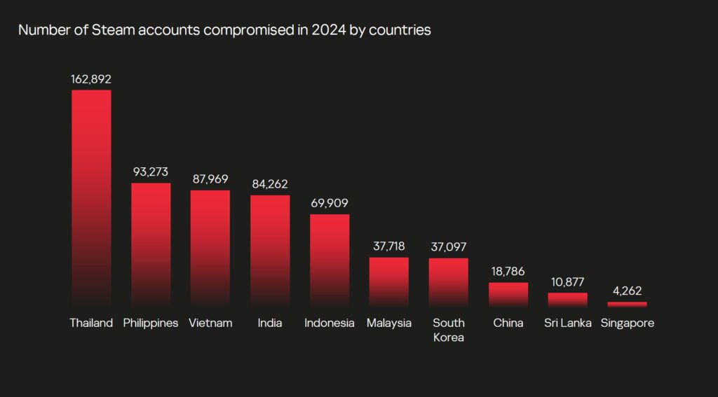 ผู้เชี่ยวชาญแคสเปอร์สกี้ได้วิเคราะห์ข้อมูลแอคเคาท์ Steam ที่รั่วไหลซึ่งเชื่อมโยงกับประเทศต่างๆ ในภูมิภาคเอเชียแปซิฟิก โดยอ้างอิงจากข้อมูลจากไฟล์บันทึกของมัลแวร์ พบว่าข้อมูลแอคเคาท์ของประเทศไทยที่รั่วไหลมีจำนวนเกือบ 163,000 รายการ รองลงมาคือฟิลิปปินส์ที่มีคู่ล็อกอินและพาสเวิร์ดที่ถูกบุกรุก 93,000 คู่ และเวียดนามอยู่ในอันดับสามจำนวนเกือบ 88,000 รายการ และพบว่าจำนวนแอคเคาท์ที่รั่วไหลต่ำสุดในจีน ศรีลังกา และสิงคโปร์ โดยมีจำนวนประมาณ 19,000, 11,000 และ 4,000 รายการ ตามลำดับ