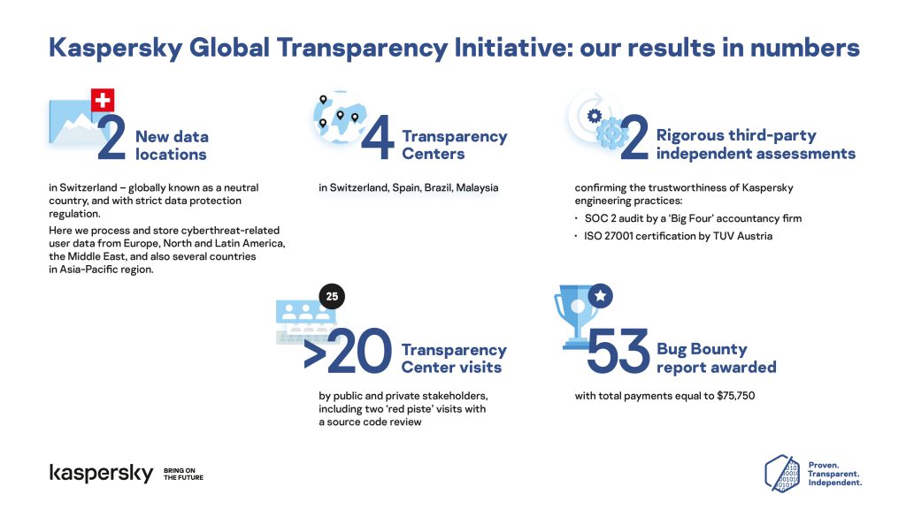 “เราได้ย้ายการประมวลผลและการจัดเก็บข้อมูลที่เกี่ยวข้องกับภัยคุกคามทางไซเบอร์จากประเทศและเขตแดนเพิ่มเติมจำนวนหนึ่งไปยังสถานประกอบการในสวิตเซอร์แลนด์ ซึ่งเป็นประเทศที่มีชื่อเสียงด้านกฎหมายคุ้มครองข้อมูลที่เข้มงวด ขั้นตอนเหล่านี้เป็นเพียงส่วนหนึ่งของ แนวทาง Global Transparency Initiative ซึ่งรวมถึงการประเมินอิสระเกี่ยวกับบริการข้อมูลของบริษัท และความสมบูรณ์ของแนวทางปฏิบัติด้านวิศวกรรม และการจัดเตรียมซอร์สโค้ดของผลิตภัณฑ์สำหรับการตรวจสอบแบบเปิด มาตรการต่างๆ เหล่านี้เน้นย้ำความมุ่งมั่นของเราในการสร้างความมั่นใจว่า เราปฏิบัติต่อข้อมูลผู้ใช้ของเราอย่างเปิดกว้างและโปร่งใสที่สุดเท่าที่จะเป็นไปได้ และเราได้ให้บริการลูกค้าและพันธมิตรด้วยโซลูชั่นและบริการที่น่าเชื่อถือและน่าเชื่อถือที่สุด” อันเดรย์ เอฟรีมอฟ ประธานเจ้าหน้าที่ด้านการพัฒนาธุรกิจ แคสเปอร์สกี้ กล่าว