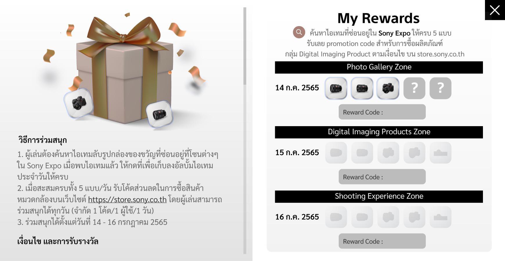 ยิ่งไปกว่านั้น ลูกค้าจะได้รับโปรโมชั่นของแถมและส่วนลดมากมาย มูลค่าสูงสุดถึง 10,000 บาท (เฉพาะลูกค้าที่ซื้อสินค้าใน Sony Expo 14-16 ก.ค. 2565 เท่านั้น) พร้อมทั้งเปิดโอกาสให้ลูกค้าได้ร่วมสนุกกับกิจกรรมมากมายบนเว็บไซต์ เพื่อสะสมไอเทมเกมไว้ในเมนู My Rewards เพื่อรับโค้ดส่วนลด 1,000 บาท/วัน (ภายใต้เงื่อนไขที่กำหนด) สำหรับใช้ในการซื้อผลิตภัณฑ์ในกลุ่มกล้อง เลนส์ และอุปกรณ์เสริมกล้องบนผ่านช่องทาง Sony Store Online (store.sony.co.th)