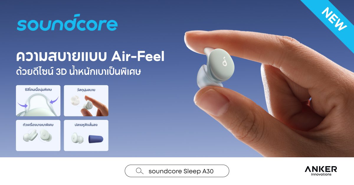 Soundcore แบรนด์เครื่องเสียงระดับพรีเมียมในเครือของแองเคอร์ อินโนเวชั่น (Anker Innovations) ซึ่งครองอันดับสามของโลกในด้านยอดจัดส่งหูฟังไร้สาย เปิดตัว Soundcore Sleep A30 หูฟังสำหรับการนอนหลับรุ่นใหม่ล่าสุดที่ออกแบบมาเป็นพิเศษสำหรับผู้ที่มีปัญหานอนไม่หลับ ผู้ที่ชอบนอนตะแคง และผู้ที่ต้องเผชิญกับสิ่งรบกวนในยามค่ำคืน Soundcore Sleep A30 ผสานเทคโนโลยีตัดเสียงรบกวนแบบแอคทีฟ (ANC) และแบบพาสซีฟ (PNC) เข้ากับเสียงบำบัดจาก AI เพื่อส่งเสริมการพักผ่อนอย่างแท้จริง ไม่ว่าจะต้องรับมือกับเสียงกรนของคนข้าง ๆ เครื่องใช้ไฟฟ้าที่ส่งเสียงรบกวนไม่หยุดหย่อน เสียงรถที่แล่นไปมาในยามดึก หรือสัตว์เลี้ยงที่เคลื่อนไหวไม่เป็นเวลา Soundcore Sleep A30 สามารถมอบความเงียบและความสบายที่จำเป็นต่อการนอนหลับให้เร็วขึ้น หลับได้นานขึ้น และตื่นขึ้นอย่างสดชื่น สะท้อนแนวคิดหลัก “เงียบสงบ หลับสบาย” พร้อมตอกย้ำวิสัยทัศน์ของ Soundcore ในการพลิกโฉมการใช้เทคโนโลยีเพื่อการพักผ่อนที่ดียิ่งขึ้นอย่างต่อเนื่อง